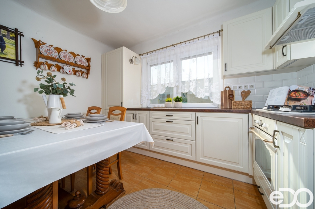 Kuchyně je vybavena kuchyňskou linkou s dostatkem úložného prostoru a pracovních ploch. Součástí jsou základní spotřebiče.