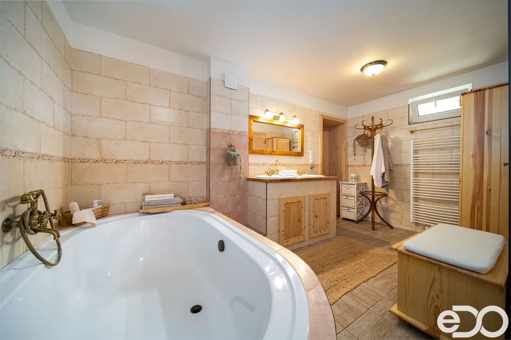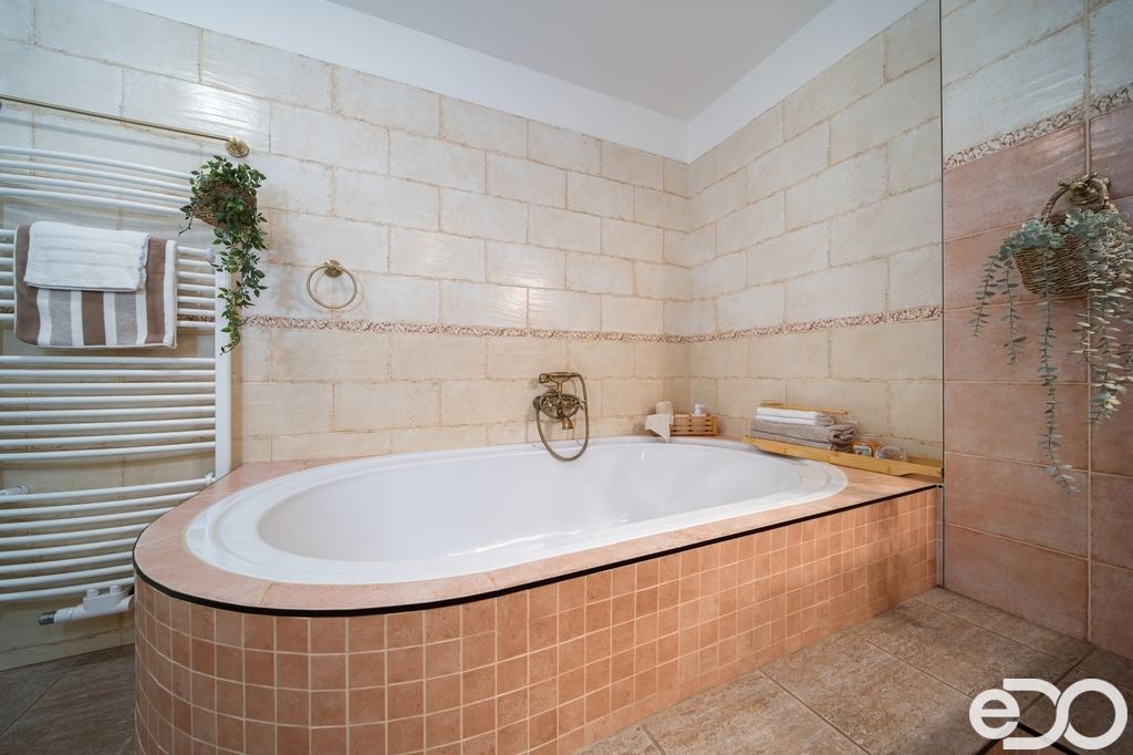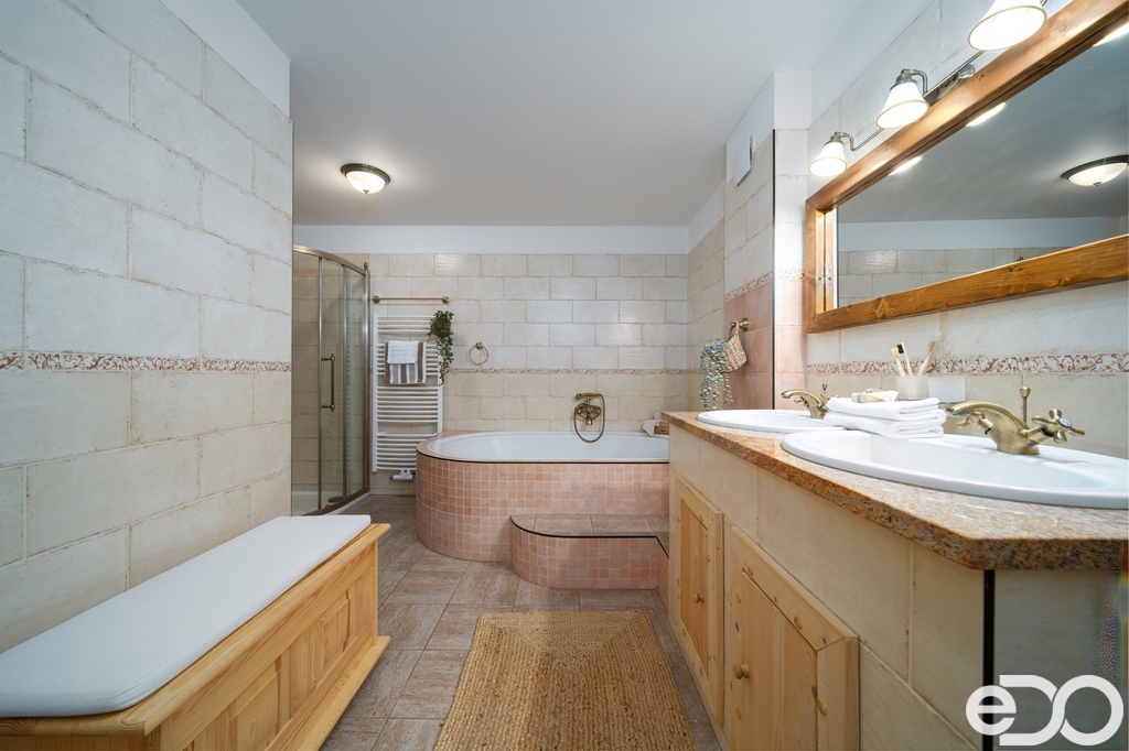 Koupelna je vybavena rohovou vanou i sprchovým koutem, dvěma umývadly a toaletou. Povrchy tvoří keramická dlažba a obklady.