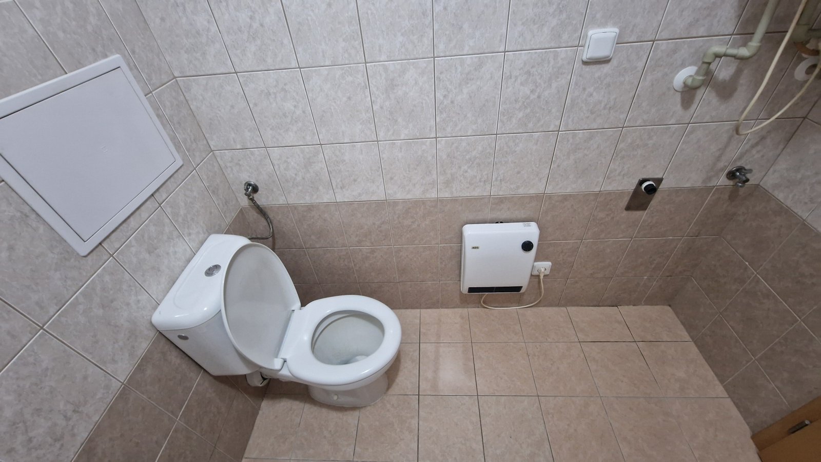 Koupelna disponuje sprchovým koutem, WC a umyvadlem. Ohřev vody zajištuje el. bojler a vytápění pak plynové těleso WAW. Podlahy jsou plovoucí v kombinaci s dlažbou.
