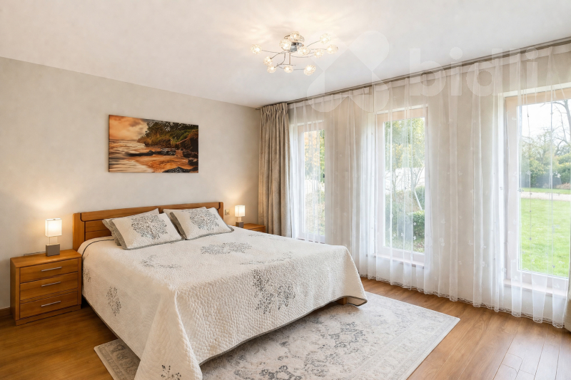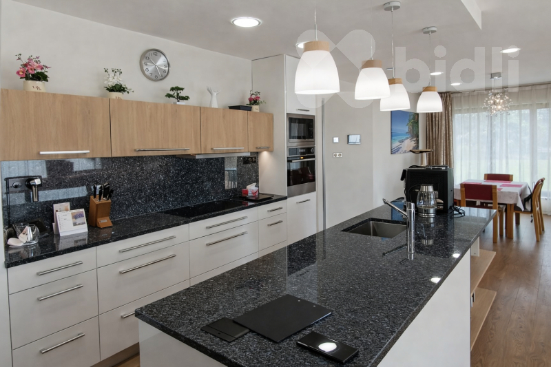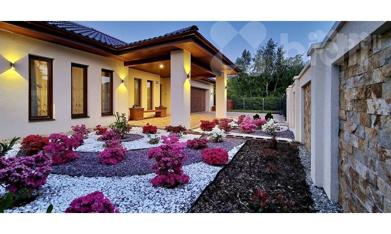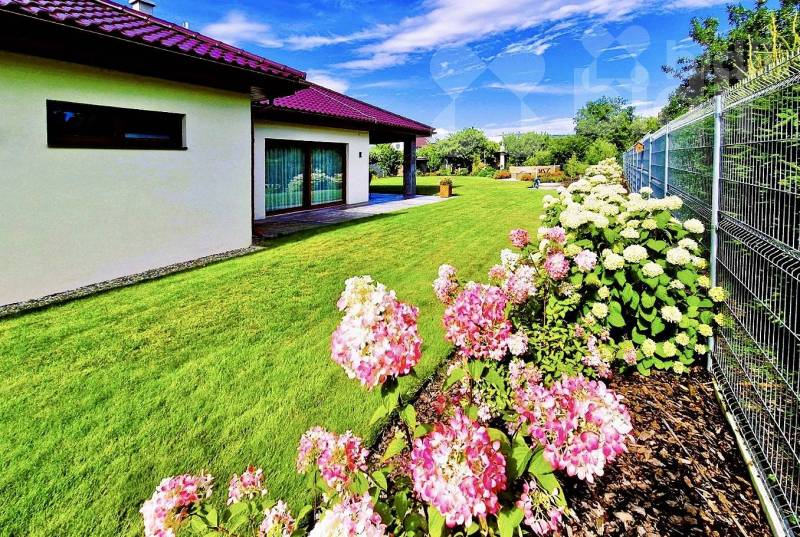 Centrální obytný prostor je doplněn krbem a kuchyní se spotřebiči nejvyšší kvality a pracovní deskou ze švédské žuly, přičemž velkoformátové prosklené portály přirozeně propojují interiér s exteriérem. Terasa, kryté venkovní posezení a pečlivě upravená zahrada plná hortenzií tak plynule navazují na hlavní obytnou část domu a vytvářejí ideální místo pro odpočinek i společné chvíle s rodinou.