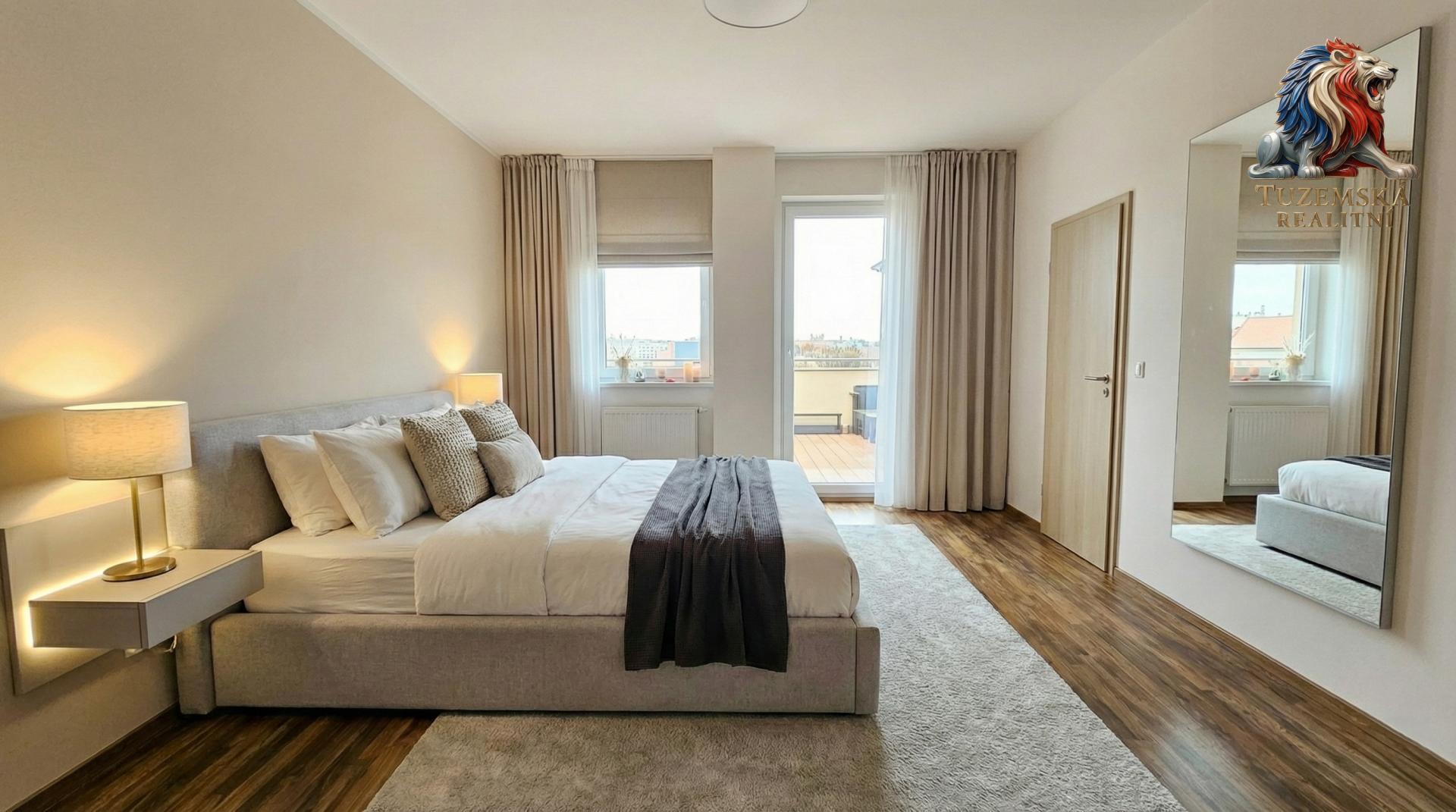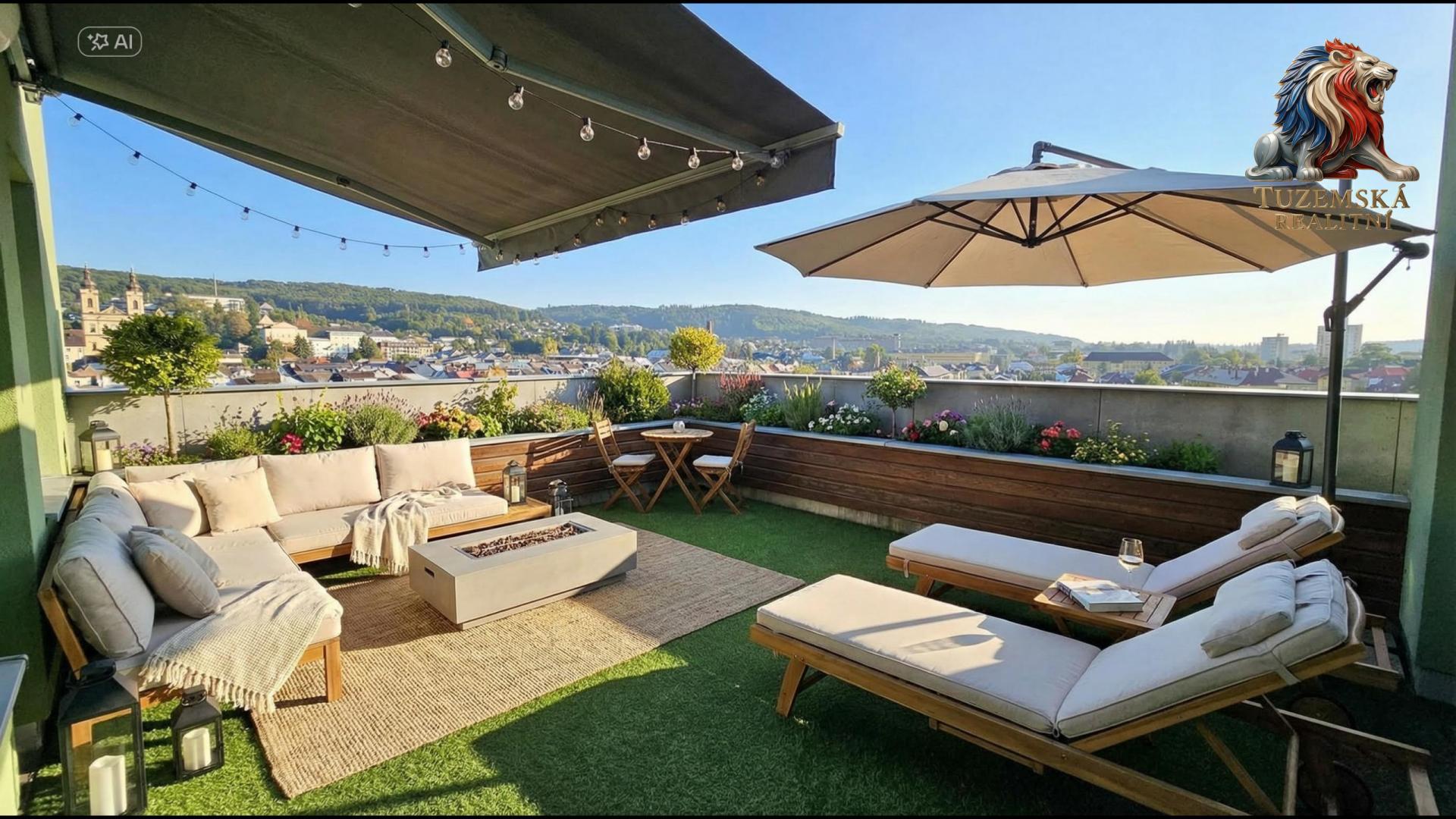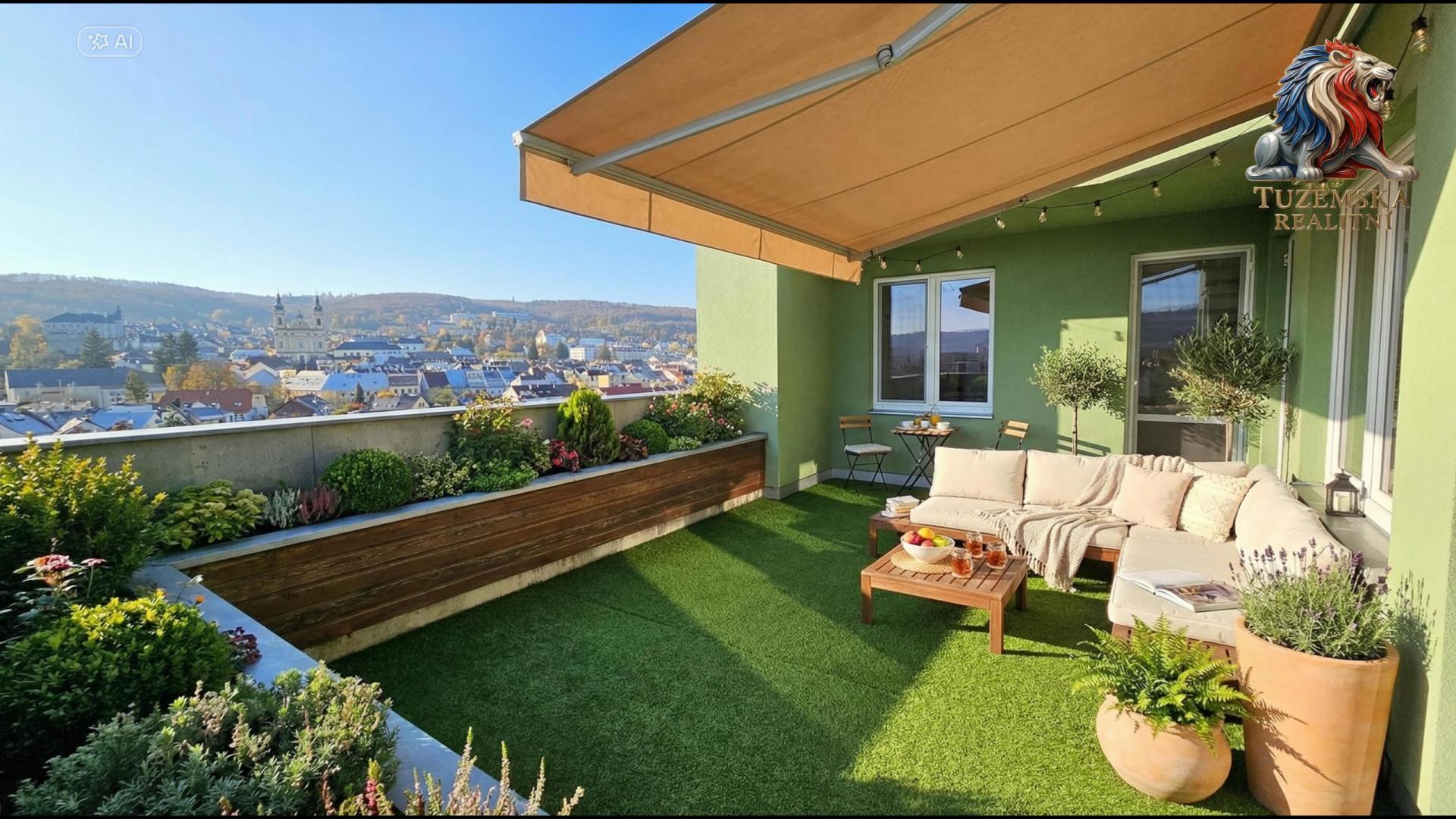 Velká terasa 30m2 s úžasným výhledem je opravdu středobodem bydlení v tomto výjimečném bytě. I Vaše první kroky při osobní prohlídce povedou jistě sem. Troje francouzská okna a to z obýváku, kuchyně a ložnice Vás na ni prostě stále zvou.