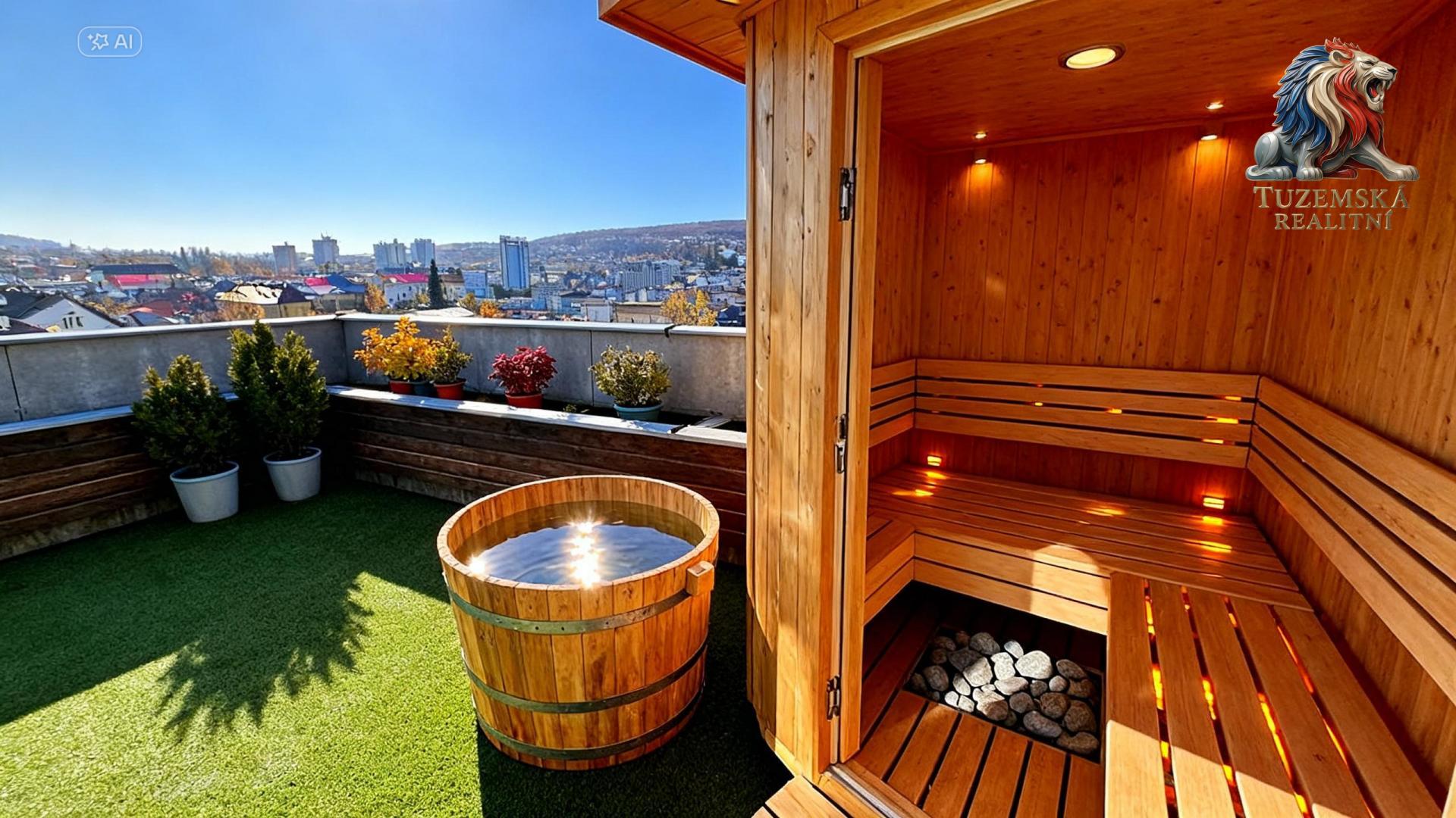 Bude-li slunce mnoho, rolovací markýza Vám poskytne příjemný stín. Majitelé bytu pod ní v létě i spali. Po obvodu terasy jsou zapuštěné květináče. Poroste Vám v nich vše, co si budete přát. Například jahody, rajčata, papriky, salát, ředkvičky, pažitka, bylinky, květiny či okrasné keře. Na zálivku je instalován kohoutek na konev či hadici, ale zaleje se i přirozeně deštěm.