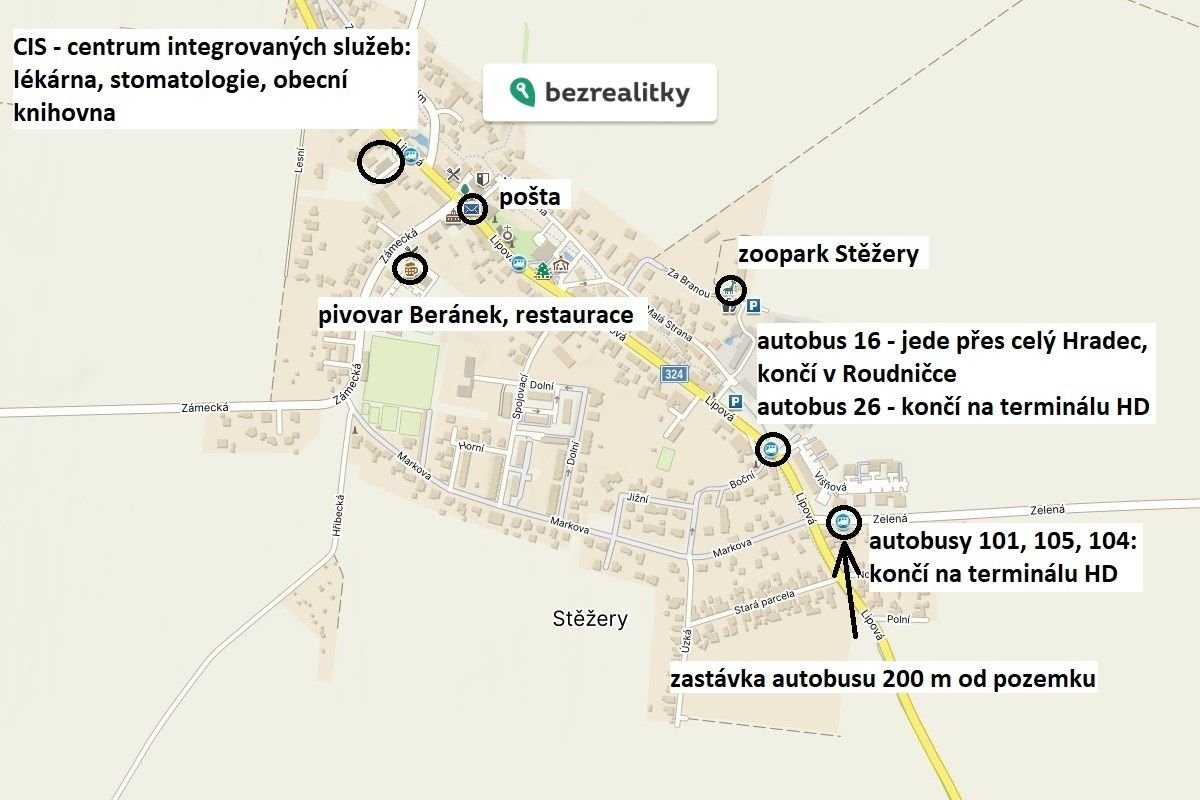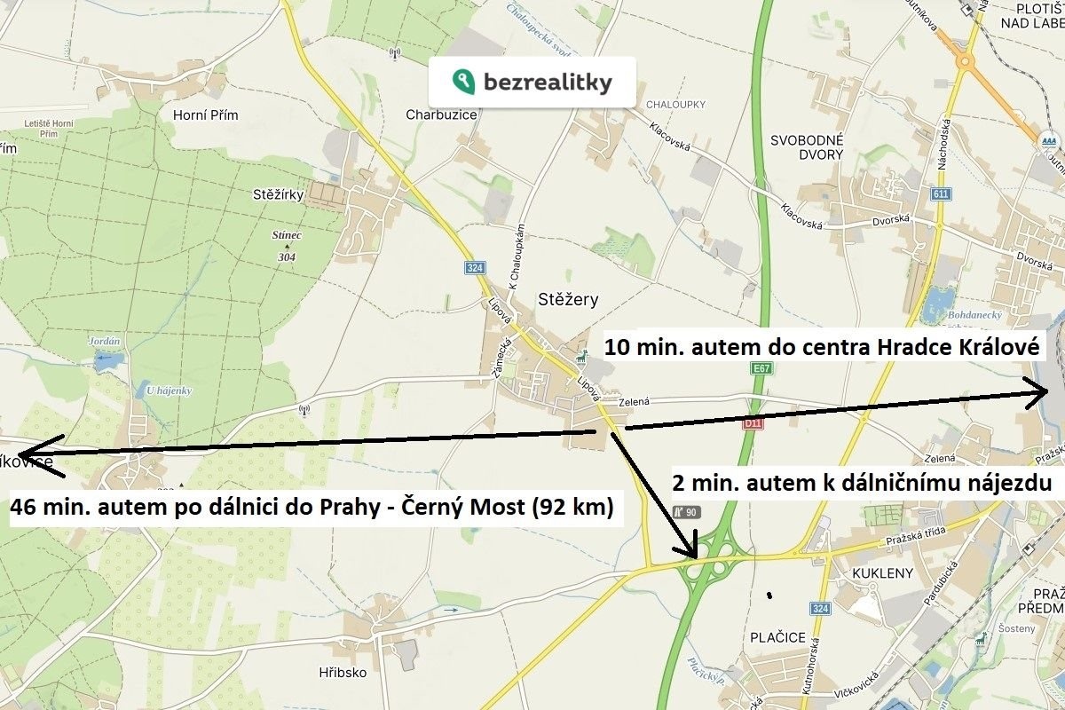 Obec Stěžery má výboru dostupnost do Hradce Králové (automobilem i MHD), kompletní občanskou vybavenost (škola, lékárna, potraviny, zubař, obecní knihovna) a velice dobré spojení do Prahy (nájezd na dálnici D11 je vzdálen 2 min. od pozemku).