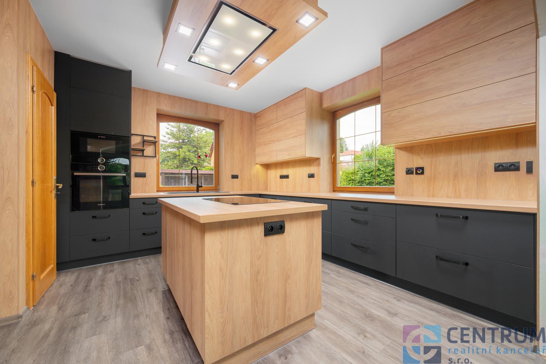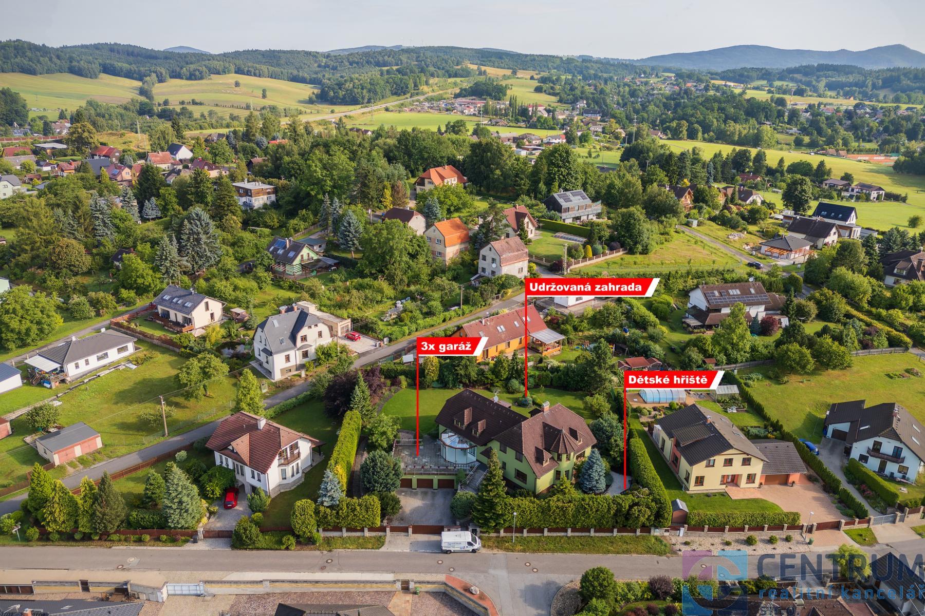 Nabízíme velkorysý rodinný dům s nádhernou zahradou ve velmi žádané lokalitě. Dům sestává ze třech podlaží. V suterénu, který je v rovině s ulicí, se nachází velká garáž pro tři až pět vozidel, prádelna, dvě technické místnosti, kotelna a sklad potravin se stabilní teplotou. Přízemí nabídne zádveří, šatnu s vestavěnými skříněmi, schodišťovou halu, koupelnu, kompletně nově zařízenou kuchyni, spíž, jídelnu, prostorný obývací pokoj a vnitřní bazén. Ve druhém nadzemním podlaží jsou na jedné straně 4 samostatné pokoje s koupelnou a na straně druhé, v rodičovském křídle, samostatný byt skládající se z obytné kuchyně, ložnice, koupelny a šatny vybavené vestavným nábytkem. Dále lze vystoupat do prostoru krovu, který lze využít pro skladování, nebo případně pro půdní vestavbu.