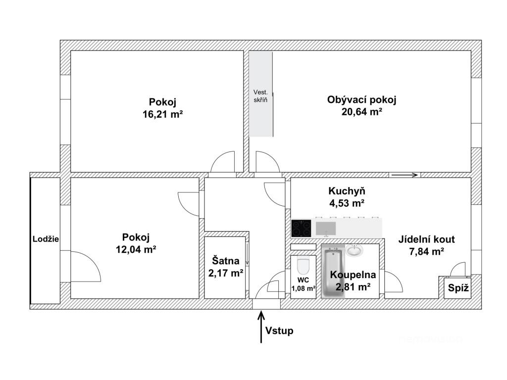 • Vstupní chodba s úložnými prostory (2,7 m²), které zvenku působí jako vestavěná skříň – ideální pro kabáty, boty i domácí potřeby