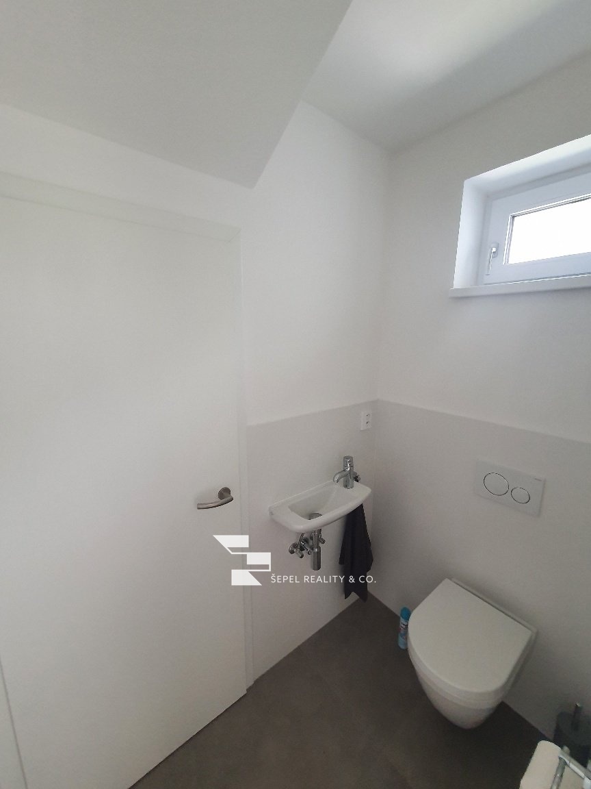 V přízemí je samostatná toaleta s umyvadlem. Z obývacího pokoje je vstup na venkovní dlážděnou terasu 14m² a zahradu cca 300m².