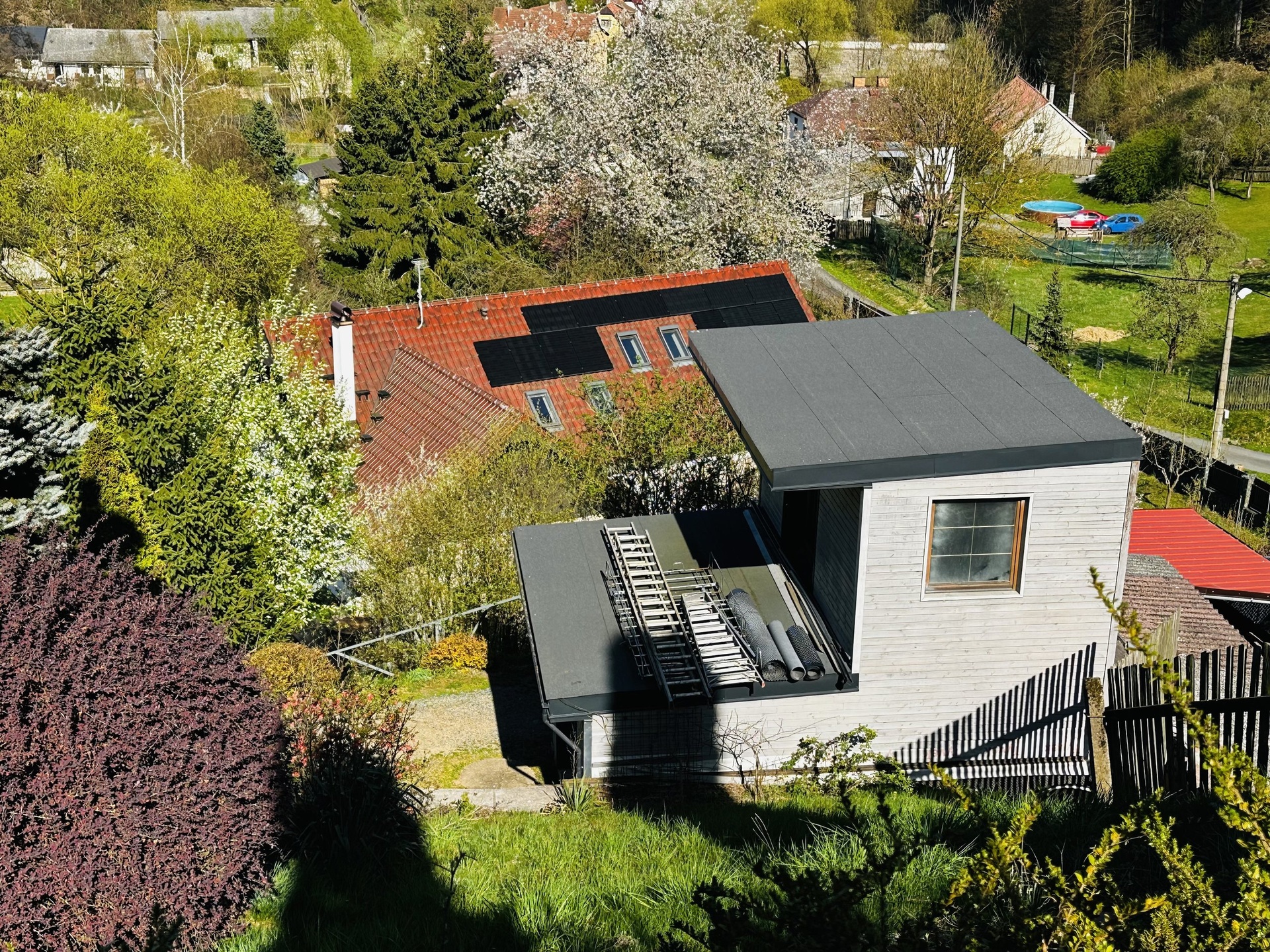 Na pozemku je také garáž/skladový prostor pro zahradní techniku nebo dílnu.