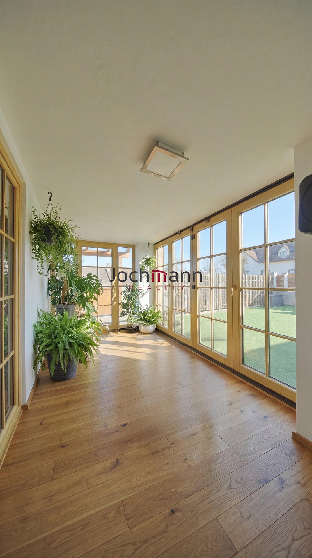 Zahrada, která k domu náleží, je menší a absolutně bezúdržbová. Lze na ní vstoupit buďto přímo zvenčí či přes zimní zahradu. Zimní zahrada pak poskytuje skvělý prostor pro relaxaci či pro rozšíření prostoru kuchyně s jídelnou, na kterou přímo navazuje.