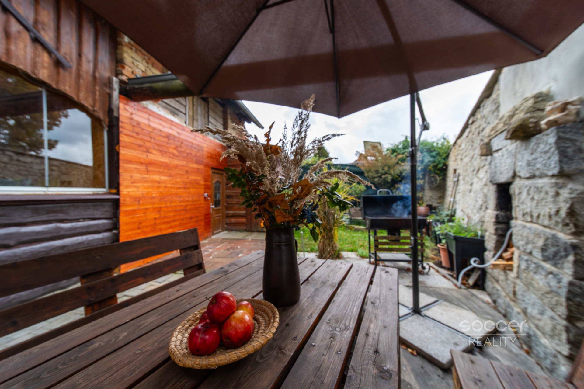 Najdete zde posezení s dřevěným nábytkem, prostor pro grilování i malou okrasnou zahrádku s keři a květinami.