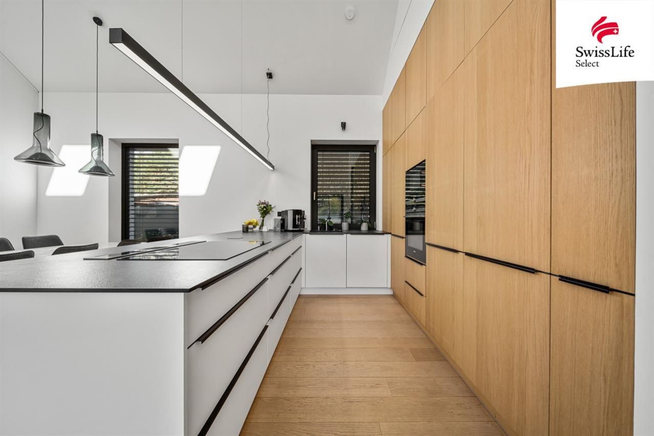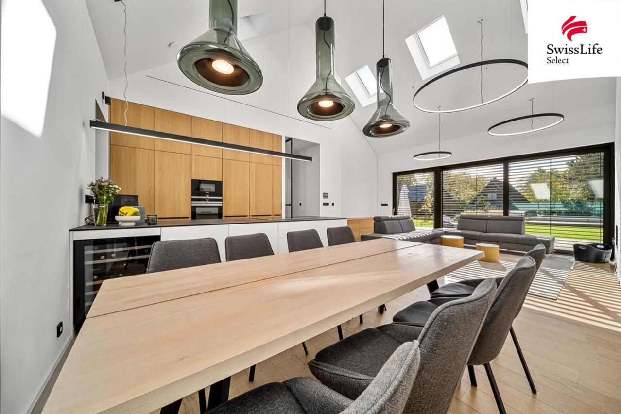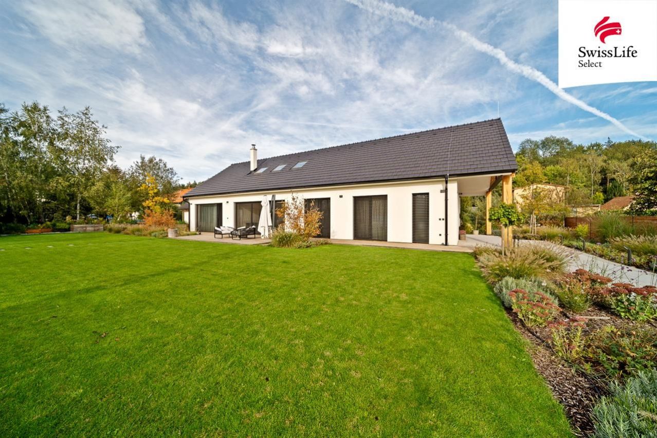 Hlavní dům o dispozici 5+kk a ploše 159 m nabízí prostorný obývací pokoj s vysokými stropy, elektricky ovládanými střešními okny a krbem. Dále dvě koupelny, samostatné WC, pracovnu, ložnici, dva dětské pokoje a technickou místnost. Podlahové topení s tepelným čerpadlem, příprava na klimatizaci a moderní technologie zajišťují úsporný provoz. Dům je částečně vybavený a připravený k nastěhování. Nadstandard podtrhují hliníkové dveře na míru a špičkové technologie.