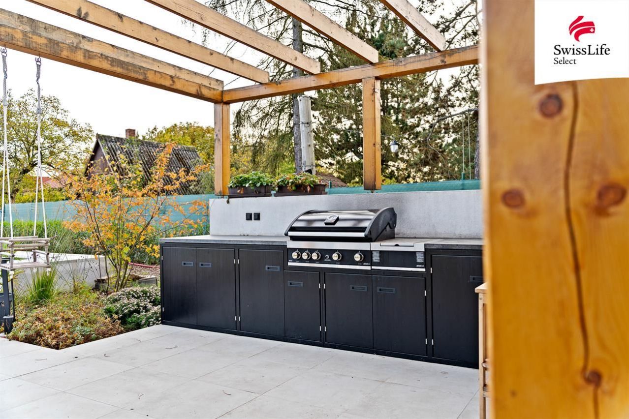 Dům se nachází v klidné části obce a má vlastní osvětlenou příjezdovou cestu, což zajišťuje maximální soukromí. Celková plocha pozemku je 1 830 m. Na pozemku nechybí kryté parkování pro dvě auta, venkovní bazén s tepelným čerpadlem, okrasná zahrada se závlahou ze studny a stylový zahradní domek s výčepem, WC, krbem, grilem a krytým posezením. K dispozici je také samostatný zahradní domek. a pozemek 368 m