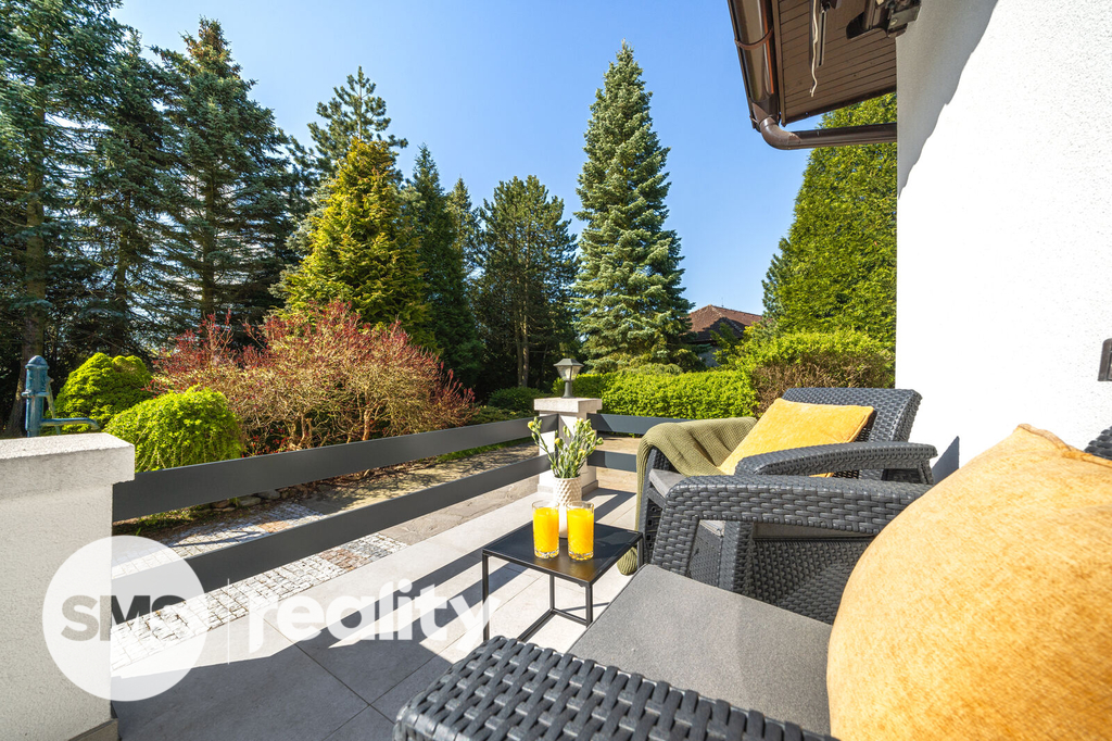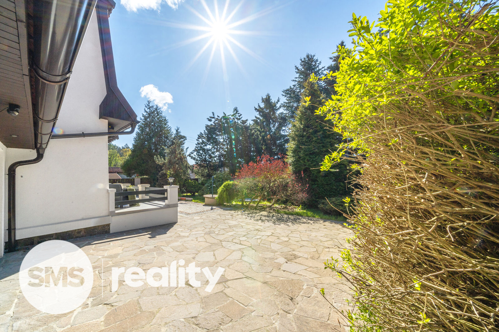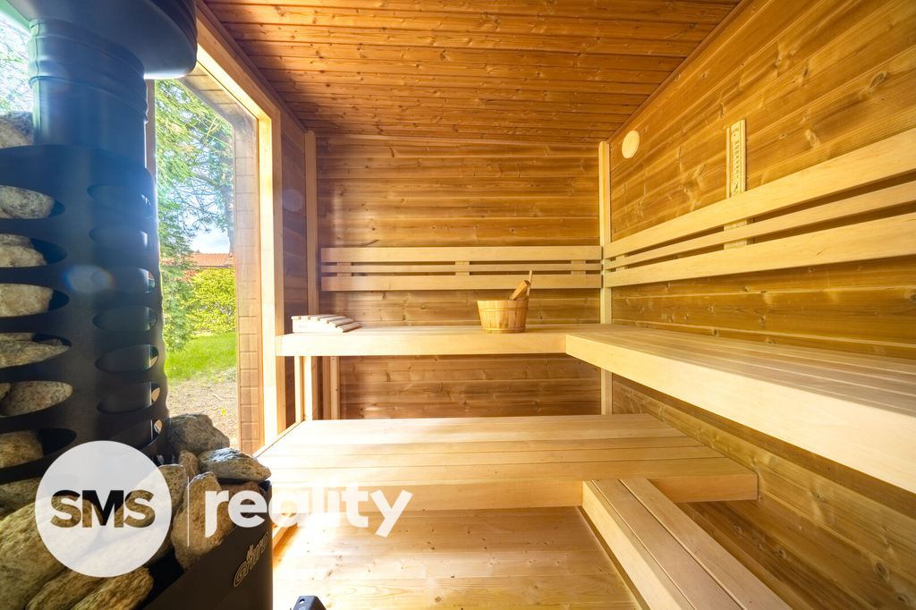 Krásná zahrada se vzrostlými stromy, okrasnými keři, jezírkem a kopanou studnou je od silnice oddělena elektrickými vraty s dálkovým ovládáním. Nabízí naprosté soukromí a v horkých letních dnech i stinná místa a naopak v zimě je majitelům k dispozici zbrusu nová finská sauna umístěná v rohu zahrady.