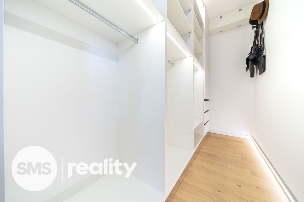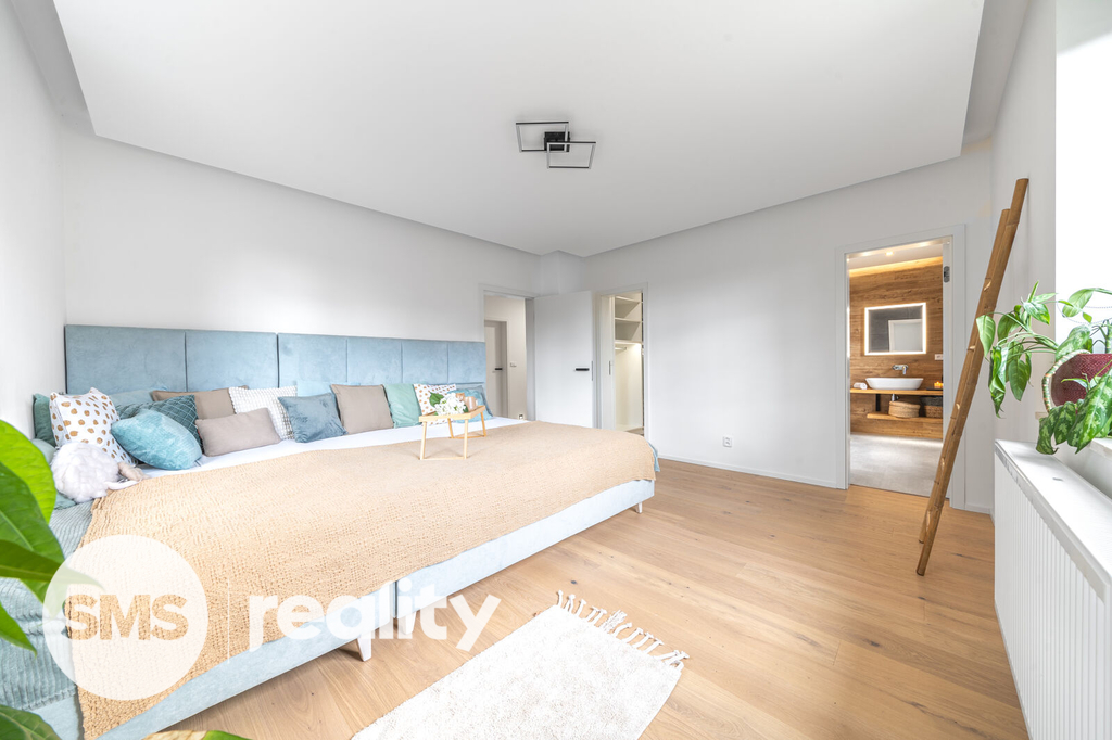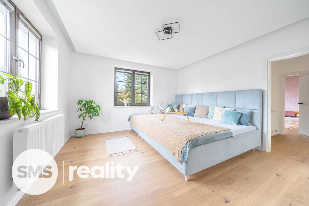 V prvním patře jsou k dispozici 2 pokoje, koupelna (sprcha a toaleta) a ložnice s vlastní koupelnou (vana a toaleta) a šatnou. Podlaha je zde masivní - dubová.