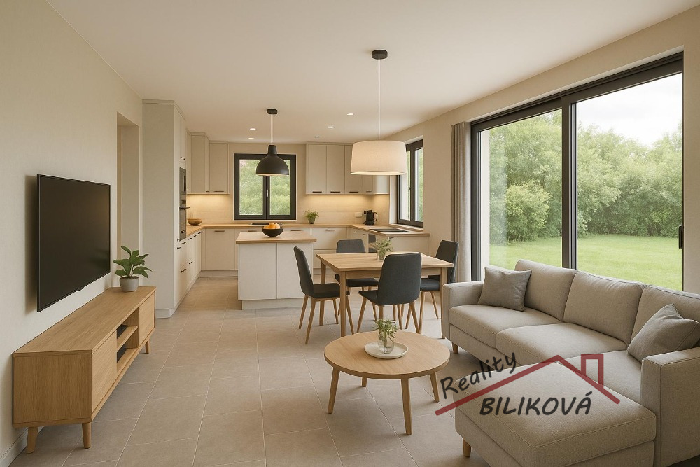 • Přízemí: vstupní veranda, chodba, kuchyně, obývací pokoj, ložnice, koupelna a samostatné WC.