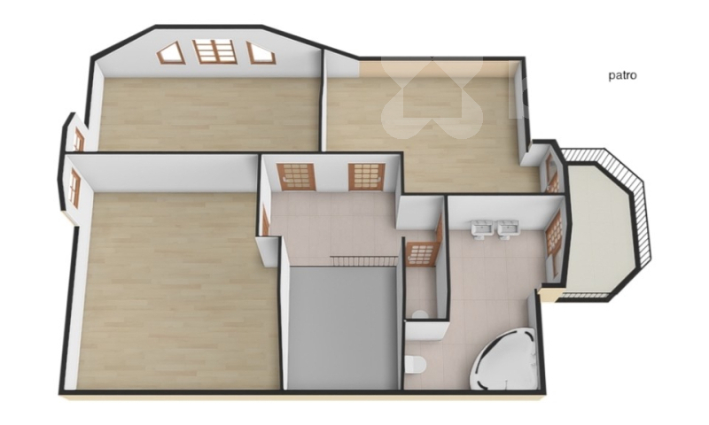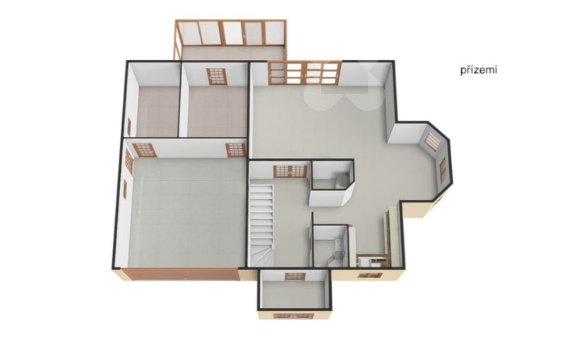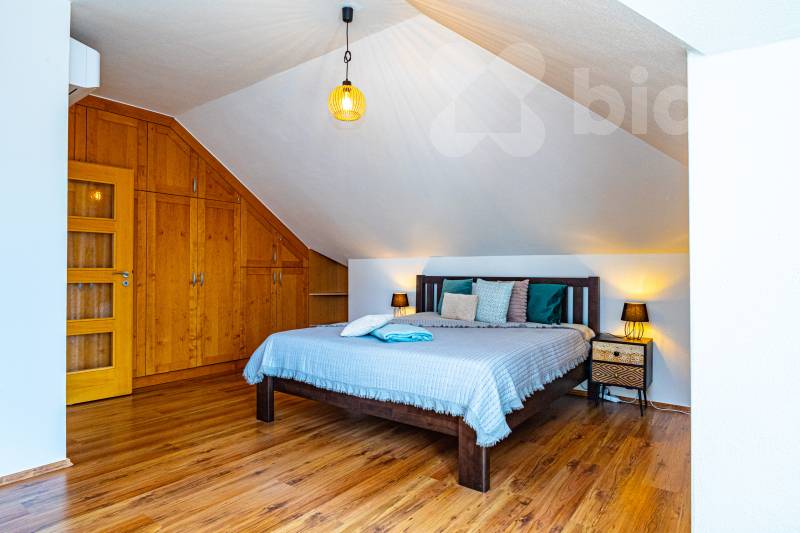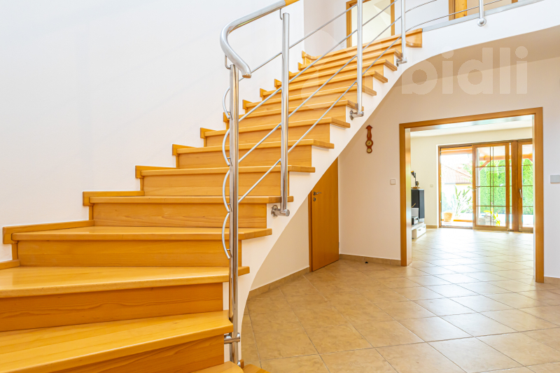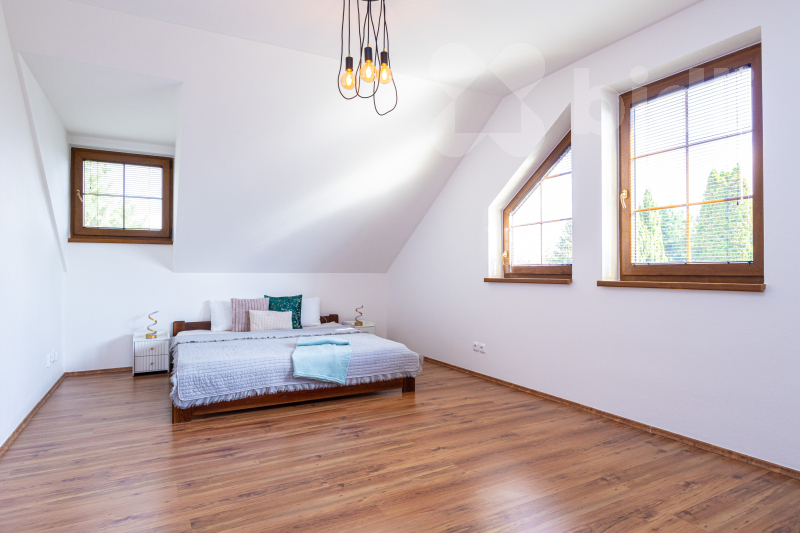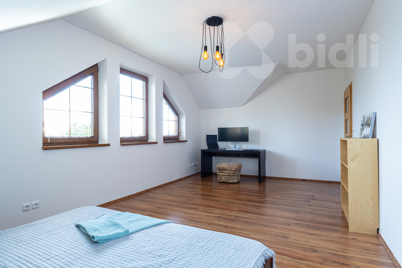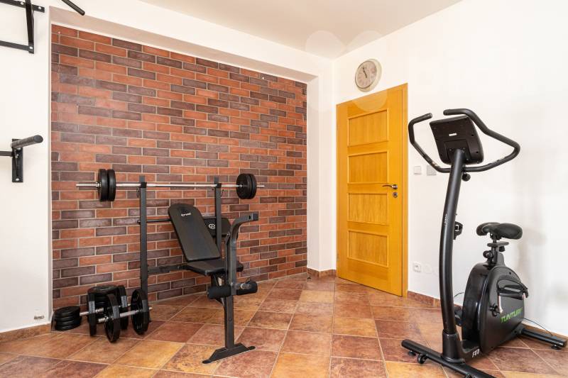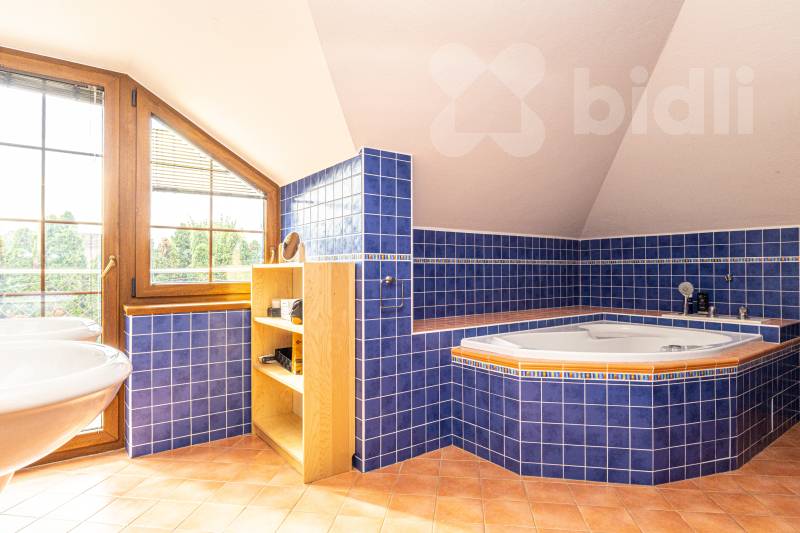 Interiér v přízemí nabízí nadstandardní obytný prostor s krbem, kuchyňským koutem, jídelnou a přímím vstupem do zimní zahrady, na terasu a zatravněný pozemek. Také tělocvičnu, prostornou garáž, technickou místnost, koupelnu s keramickými obklady a toaletou. Monumentální schodiště Vás přivede do patra, kde jsou tři prostorné neprůchozí pokoje se samostatnými vstupy (dvě útulné ložnice, přístup na terasu a praktická pracovna s kulečníkovým stolem), velká koupelna s přístupem na terasu, rohovou vanou a dvěma umyvadly i další samostatná toaleta.