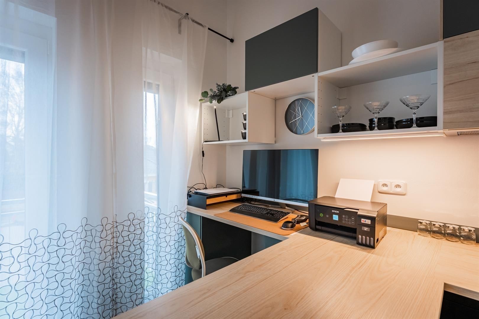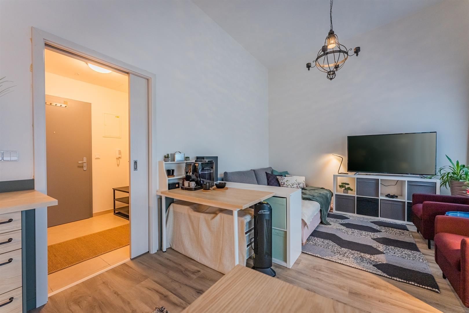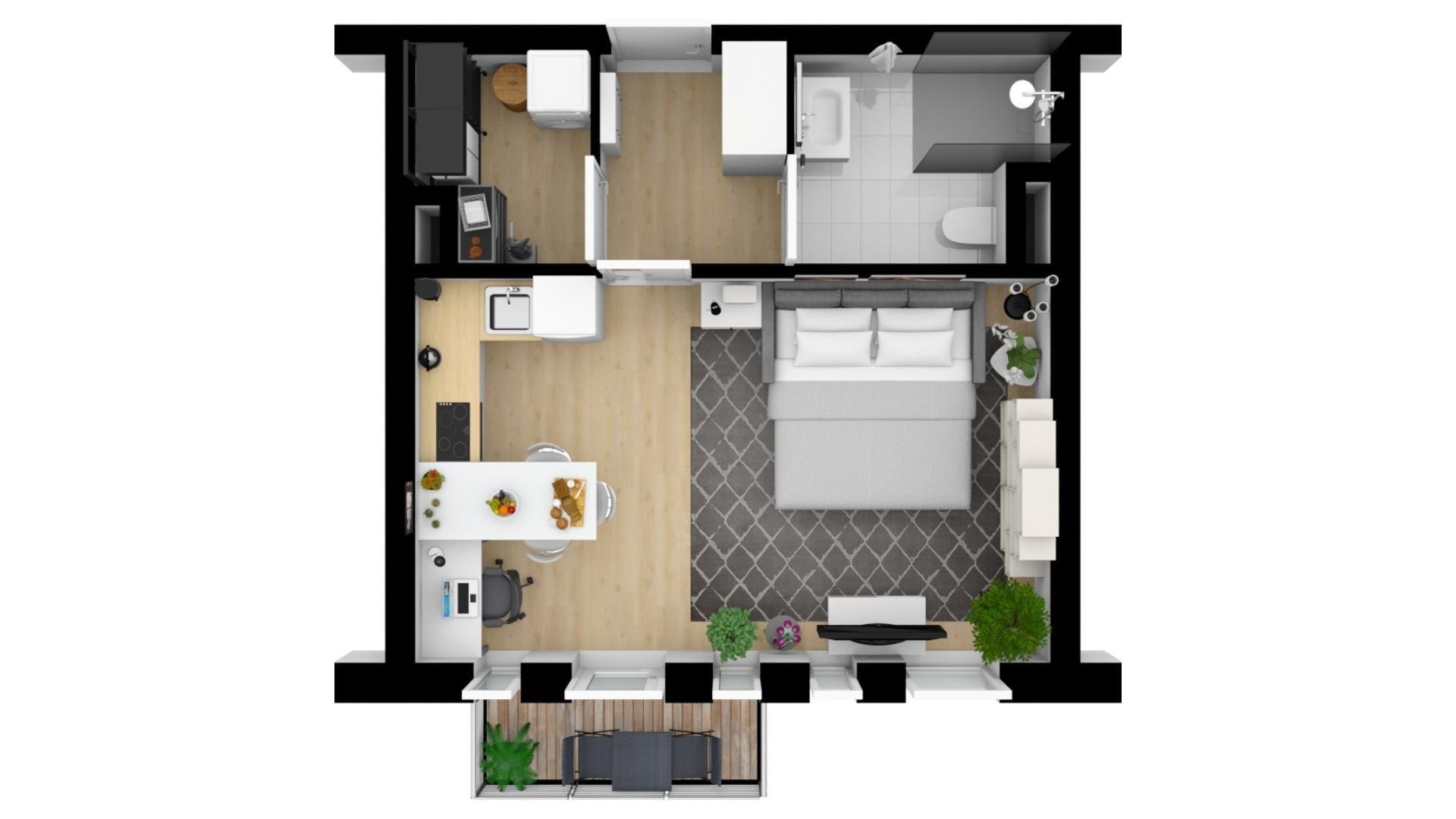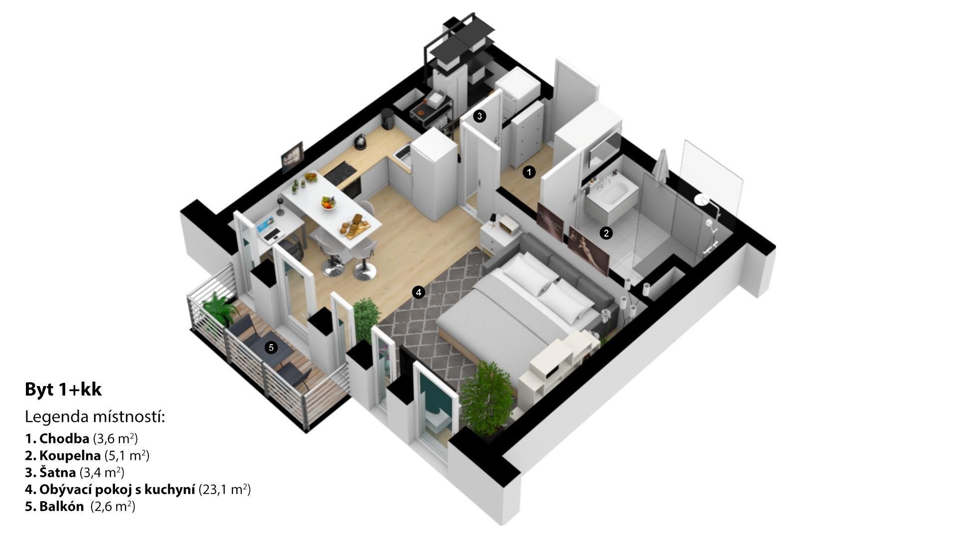 Promyšlená dispozice na 35,2 m² – to je vstupní hala s šatnou (využitelnou jako malá ložnice), koupelna s WC a hlavní obytný prostor s kuchyňským koutem. Moderní kuchyňská linka s indukční deskou, troubou a lednicí je připravená k okamžitému nastěhování. Velkoformátová okna přes celou šířku pokoje, balkon a pracovní kout doplňují celek, ve kterém má všechno svou logiku.
