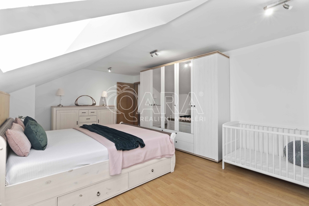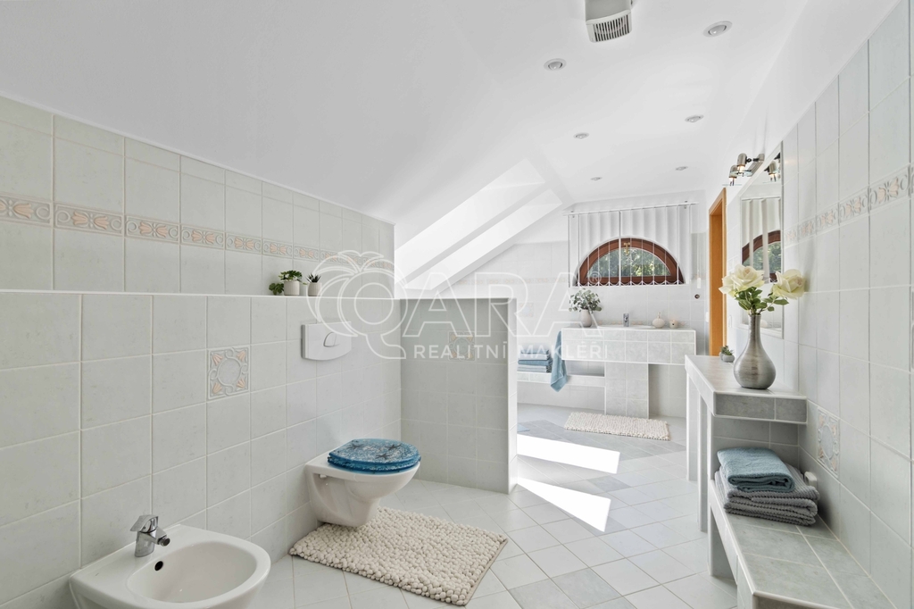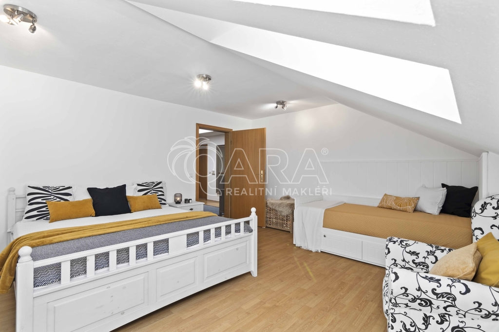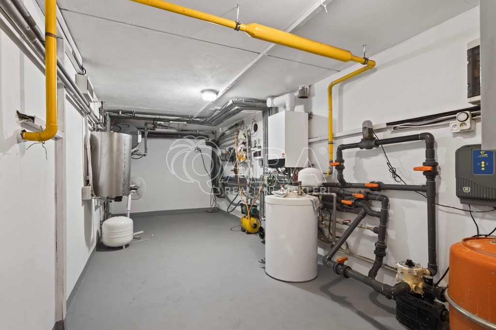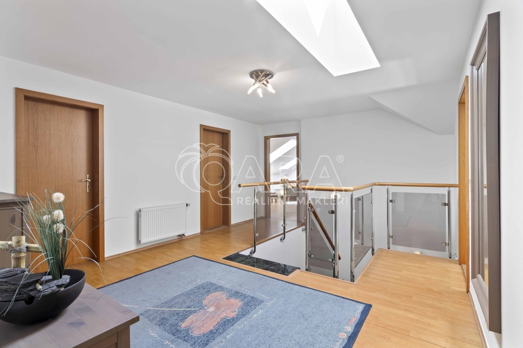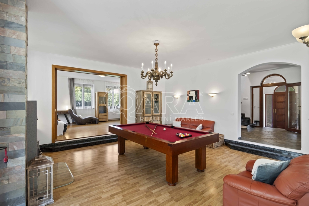 Uvnitř vás čeká pět samostatných a prostorných ložnic, více než šedesátimetrový obývací pokoj, rozdělený na klidovou a společenskou zónu s kulečníkovým stolem a krbem a v suterénu najdete ještě i fitness a společenskou místnost, kde se potkává rodina i přátelé.