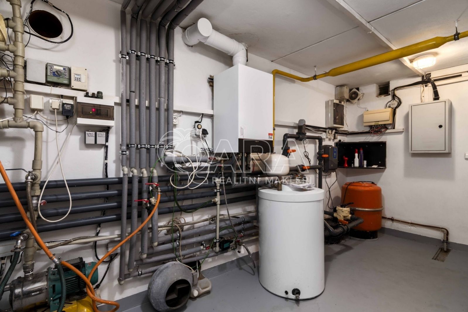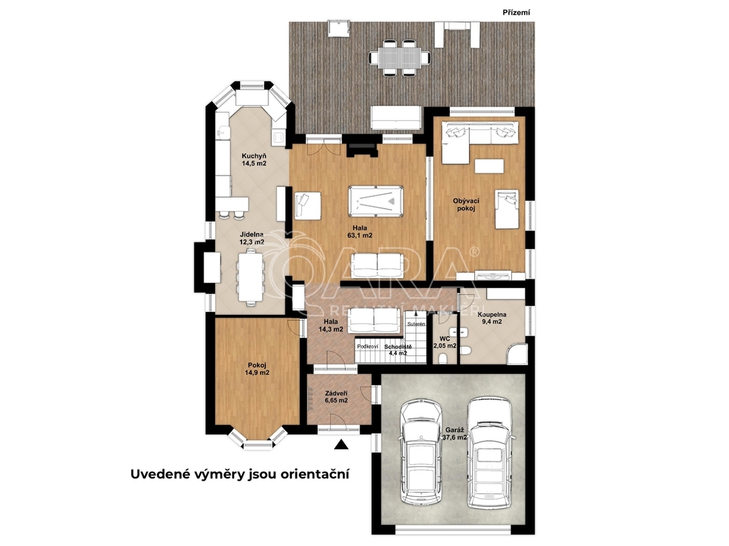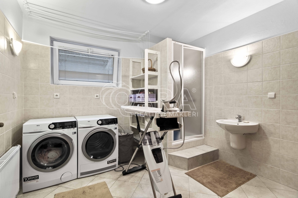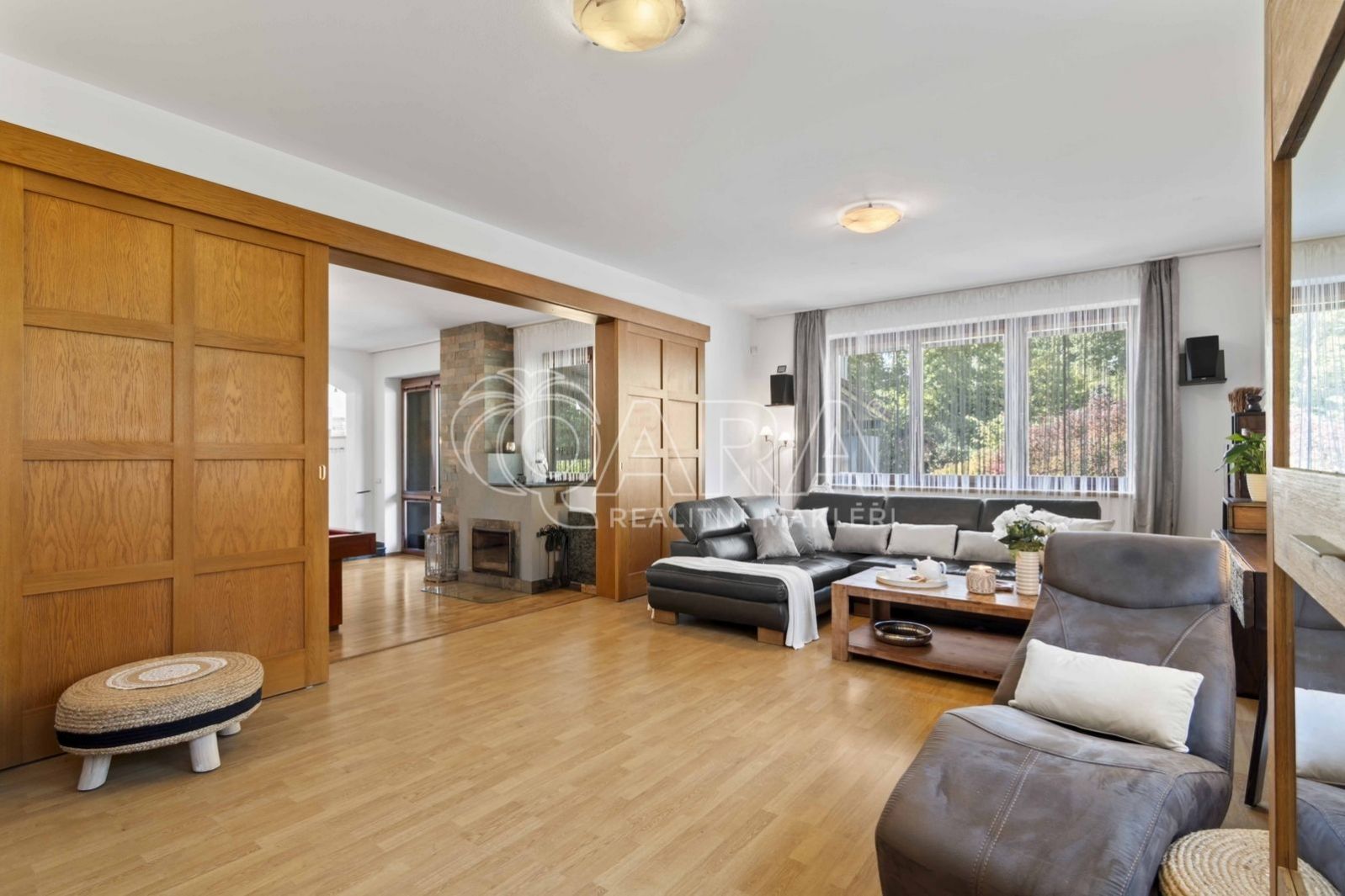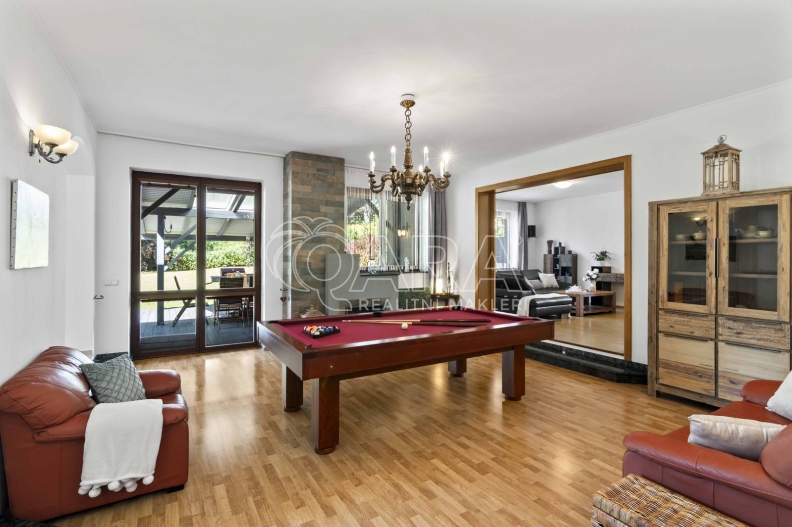 Uvnitř vás čeká pět samostatných a prostorných ložnic, více než šedesátimetrový obývací pokoj, rozdělený na klidovou a společenskou zónu s kulečníkovým stolem a krbem a v suterénu najdete ještě i fitness a společenskou místnost, kde se potkává rodina i přátelé.