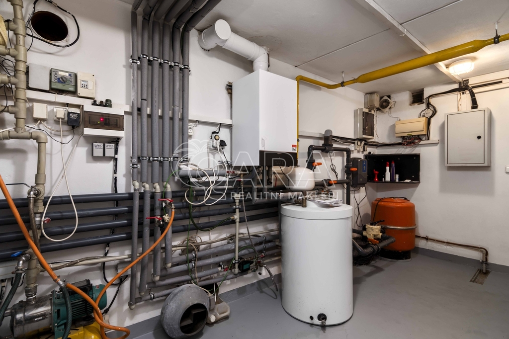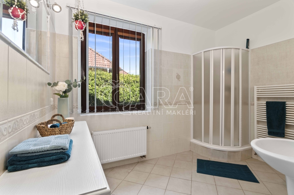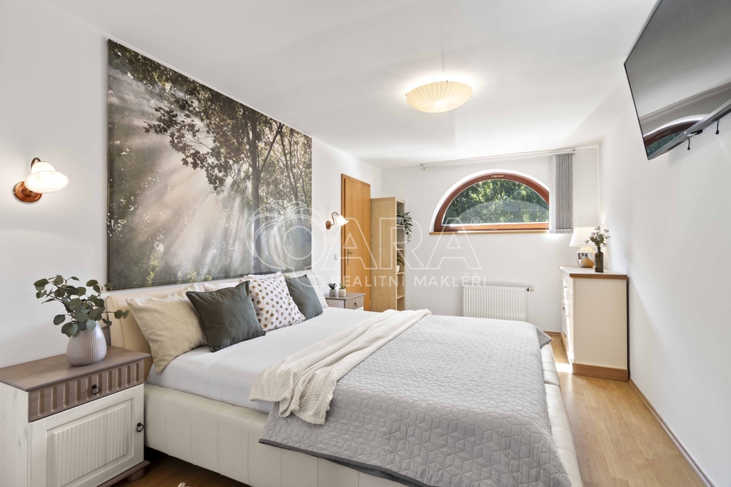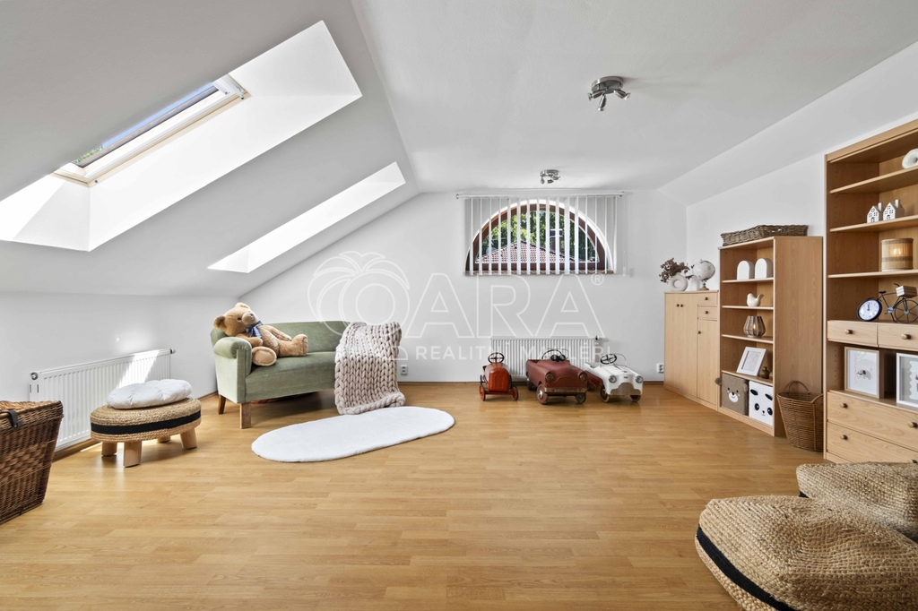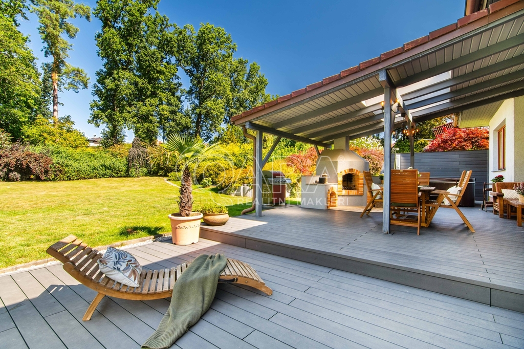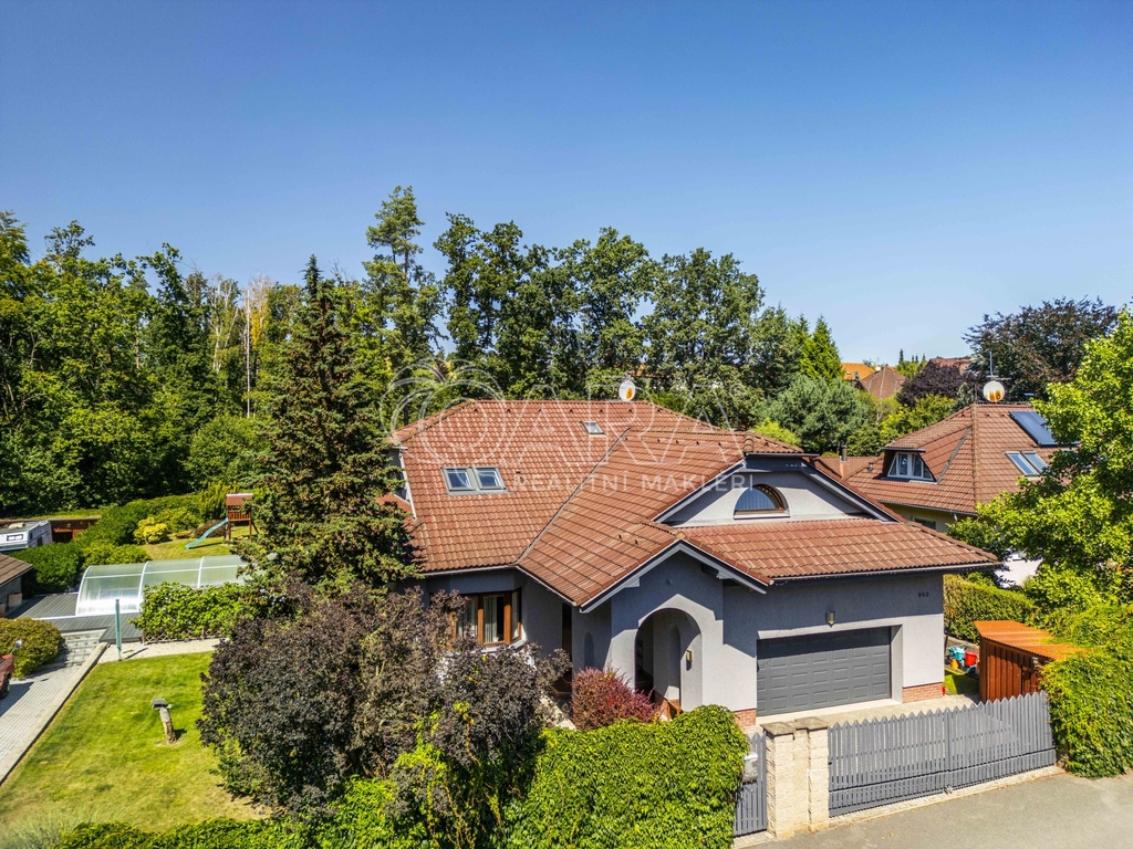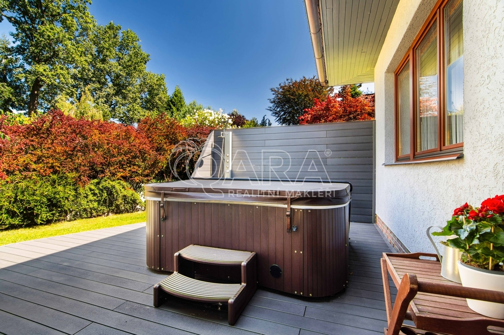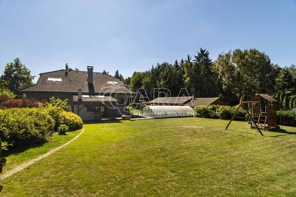 Pozemek o rozloze 1748 m² obklopený lesem je víc než jen místo k posezení. Bazén, vířivka, pergola, venkovní krb s posezením, malé dětské hřiště, a pokud vám nestačí téměř čtyřicetimetrová uzavřená dvougaráž, protože máte trochu větší vozový park nebo třeba karavan, vejdete se na pozemek pohodlně i s vašimi dalšími motorovými mazlíčky. Všechno tu má svoje místo.