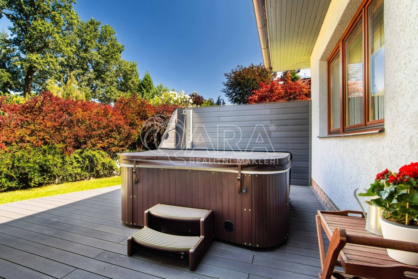 Pozemek o rozloze 1748 m obklopený lesem je víc než jen místo k posezení. Bazén, vířivka, pergola, venkovní krb s posezením, malé dětské hřiště, a pokud vám nestačí téměř čtyřicetimetrová uzavřená dvougaráž, protože máte trochu větší vozový park nebo třeba karavan, vejdete se na pozemek pohodlně i s vašimi dalšími motorovými mazlíčky. Všechno tu má svoje místo.