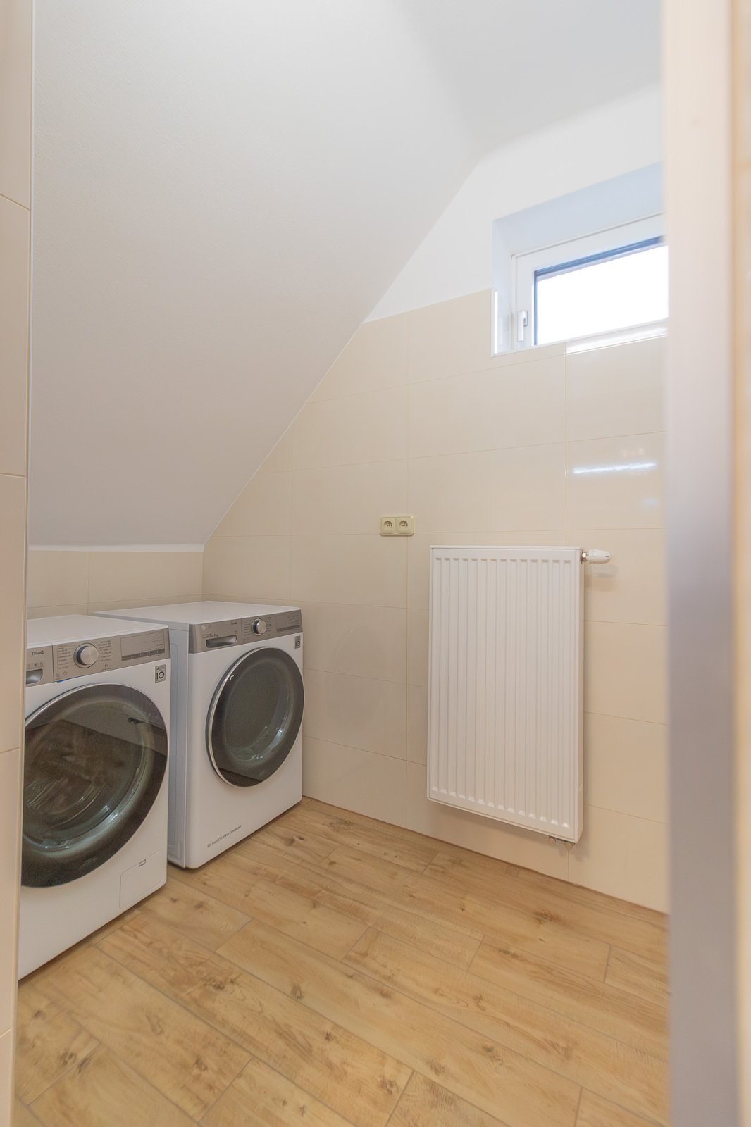 Suterén domu je kompletně podsklepený a nabízí nadstandardní množství úložného a technického prostoru. K dispozici jsou dvě garáže, prádelna, kotelna a dva samostatné sklepy.