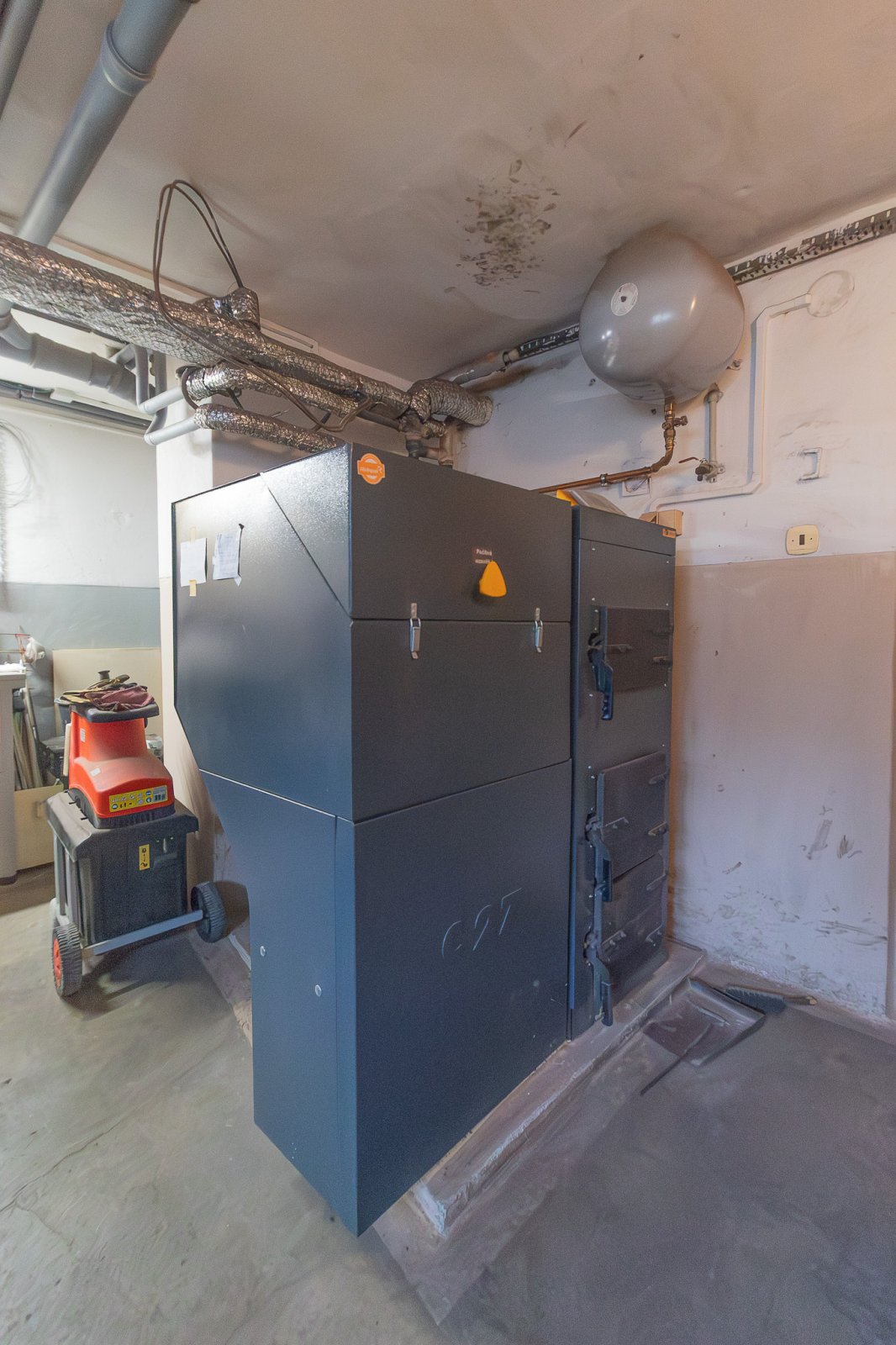 Vytápění automatickým kotlem na ÚT/ TP, voda zavedena z obecního řádu, odpad sveden do kanalizace, el. 220/380V.