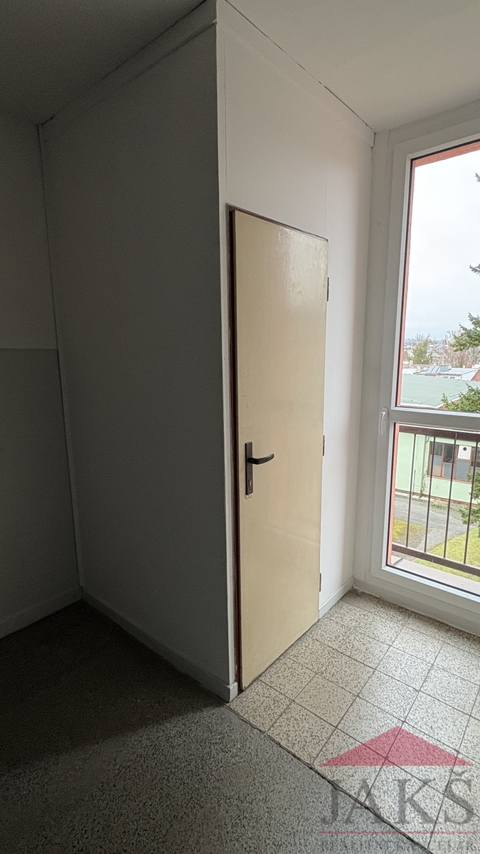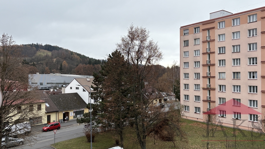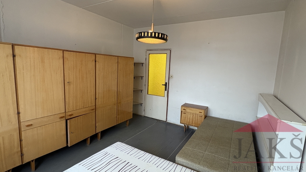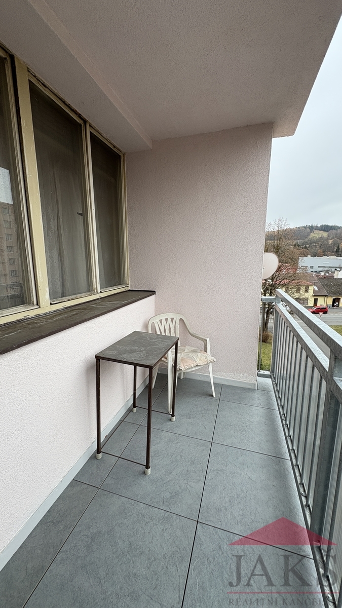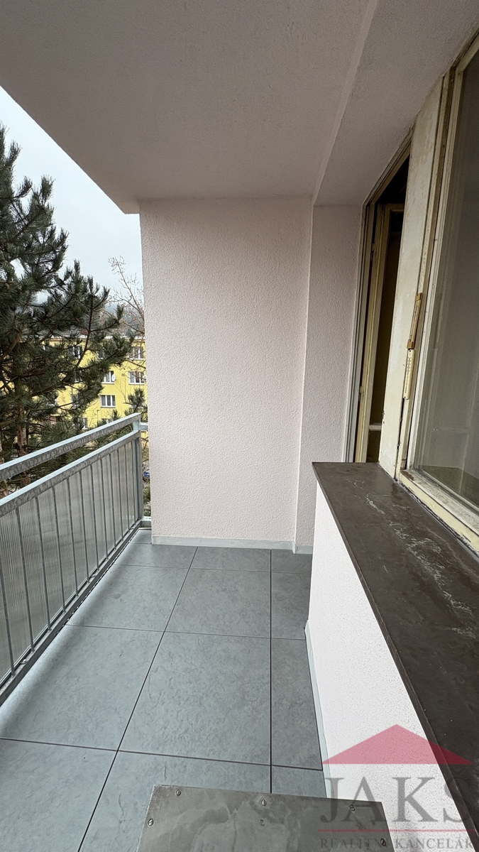 Popis: chodba s šatnou, WC, koupelna (sprchový kout, umyvadlo), kuchyň (kuch. linka s s plynovým sporákem, digestoří a pračkou) s jídelnou s výhledem na město, prostorný pokoj (lze rozdělit na dva pokoje díky 2 oknům a dvěma vchodům, aktuálně jeden zazděný), ložnice a obývací pokoj s velkou renovovanou lodžií s orientací na jih.