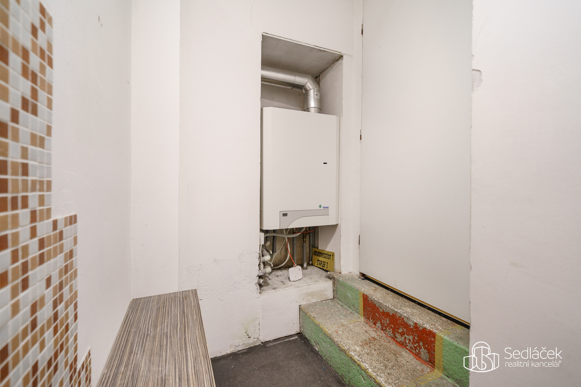 Na chodbě před bytem je pravidelně servisovaný plynový kotel, který zajišťuje vytápění bytu i ohřev TUV.