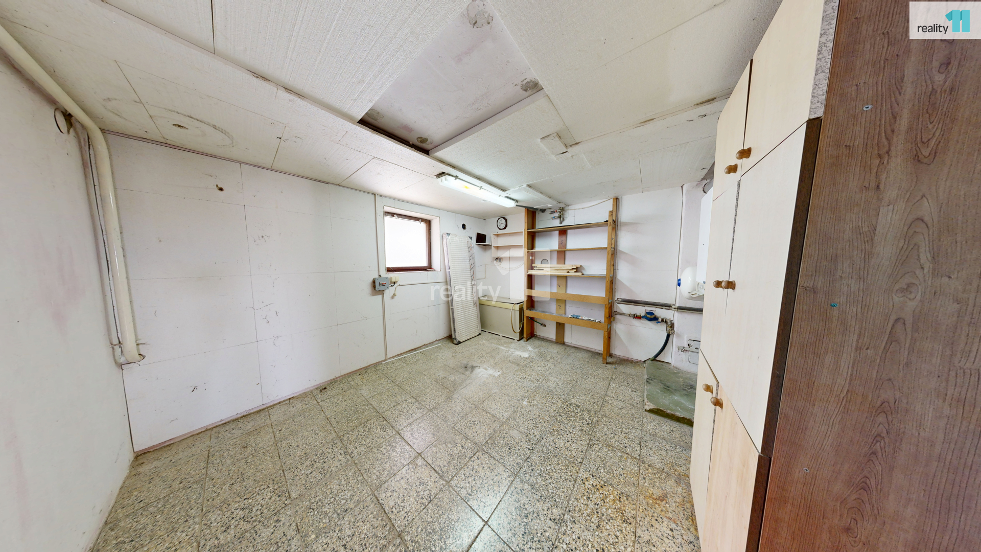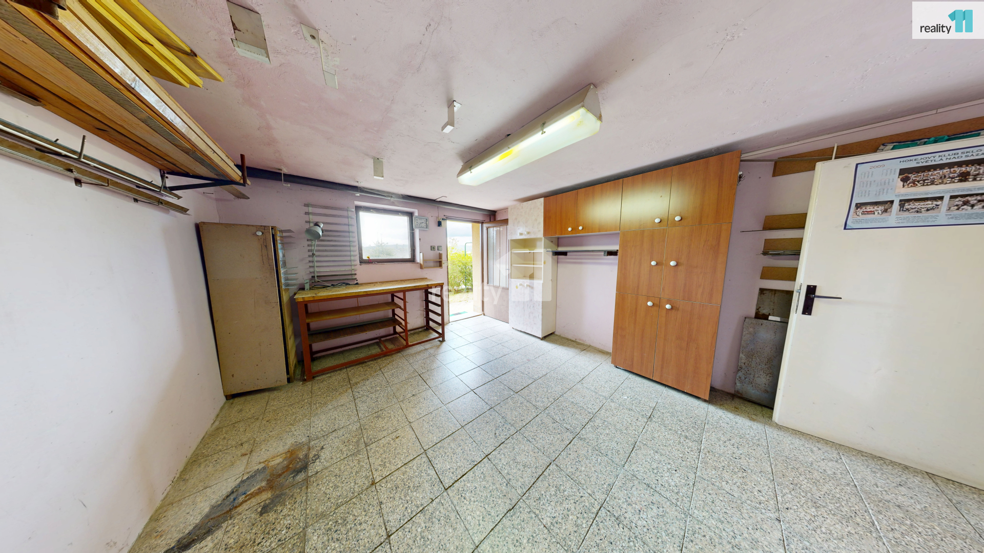 Přízemí domu (83 m²) slouží převážně jako technické zázemí. Z ulice se sem dostaneme garážovými vraty nebo pohodlně po schodech z hlavního obytného patra. Najdeme zde chodbu, garáž, technickou místnost, dva praktické sklady a dílnu s přímým vstupem na zahradu, která je ideálním místem, kde si od ruchu domácnosti odpočinete mezi svěrákem a vůní pilin.