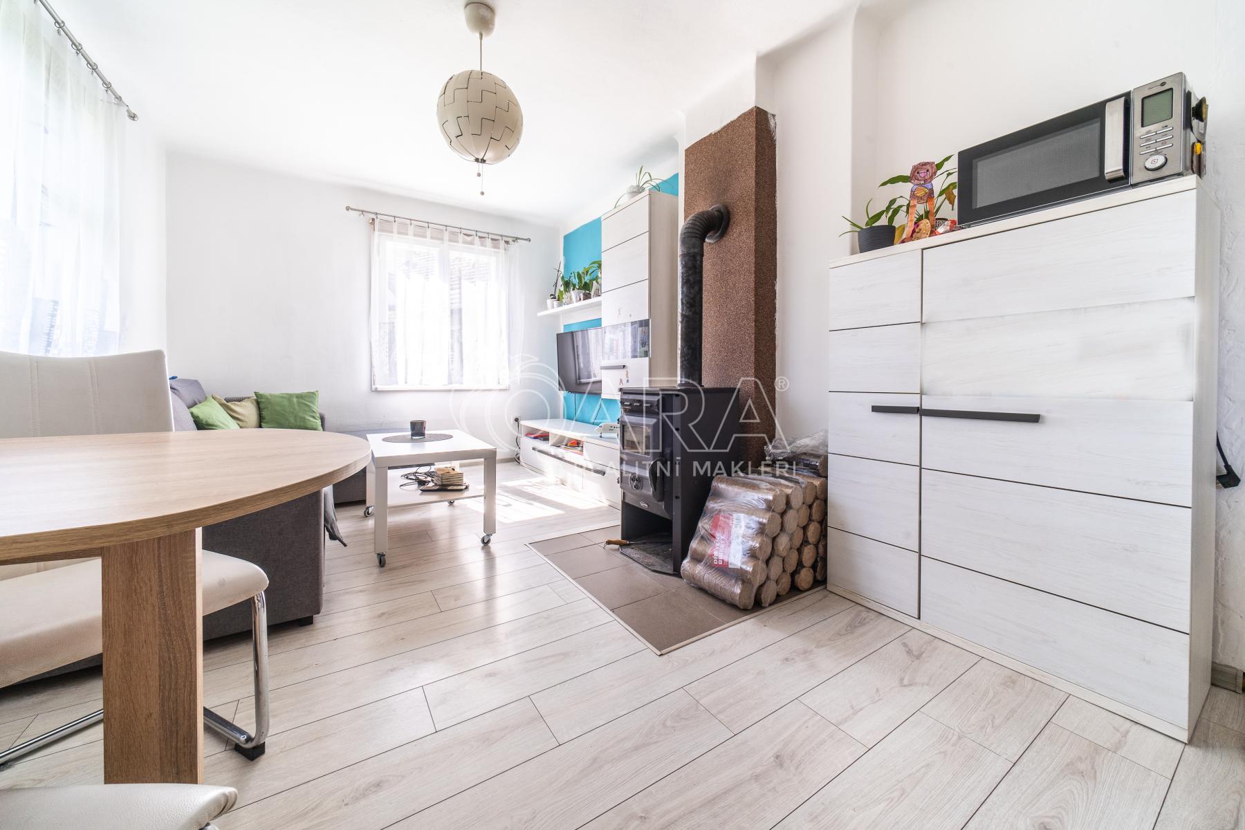 - přízemí - obytné plochy 50 m2 - veranda se vstupní chodbou, jídelna s kuchyní a obývacím pokojem, pokoj, koupelna se sprchovým koutem, samostatné WC, komora, prostorná světlá půda pro skladování, malý sklípek. Dřevěná okna, podlahy keramická dlažba, plovoucí, topení - krbová kamna, odpady kanalizace, voda obecní, studna - užitková, plynová přípojka na hranici pozemku. U domu terasa s posezením.