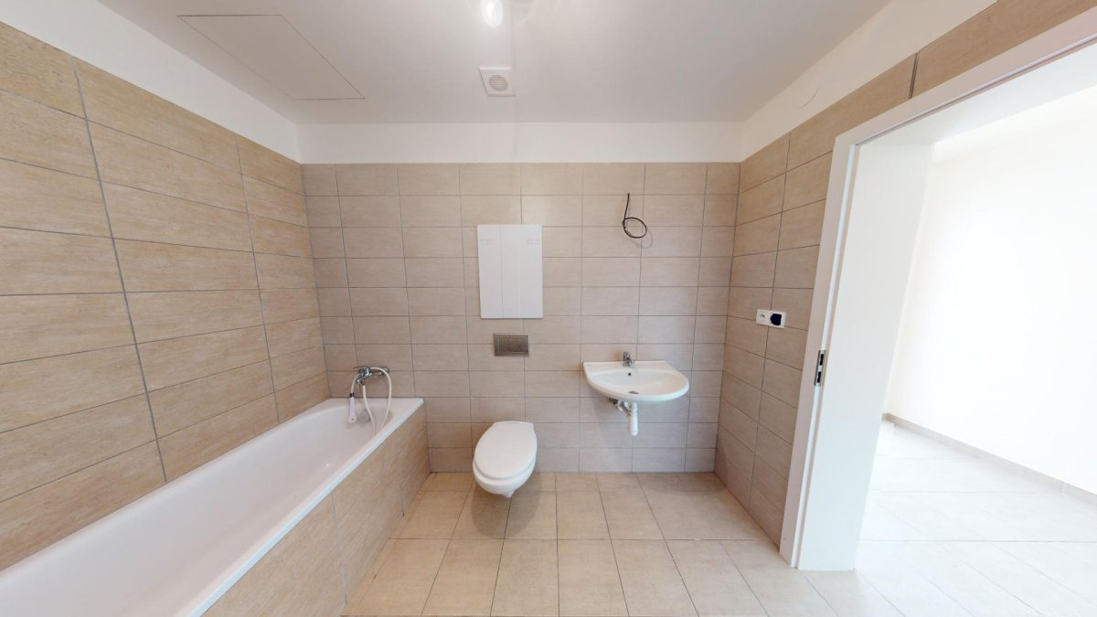 Byt se nabízí nevybavený. Kuchyňská linka disponuje sklokeramickou deskou a troubou. Součástí koupelny je vana, umyvadlo, topný žebřík a toaleta. V celém bytě budou dodělané svítidla. Na zemi je laminát a dlažba.