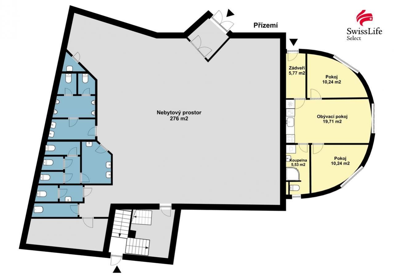 nebytový prostor (276 m) lze přestavět na další apartmány, byty nebo využít pro podnikání například jako ordinaci, soukromou kliniku s apartmány, snídaňové bistro k apartmánům ad.