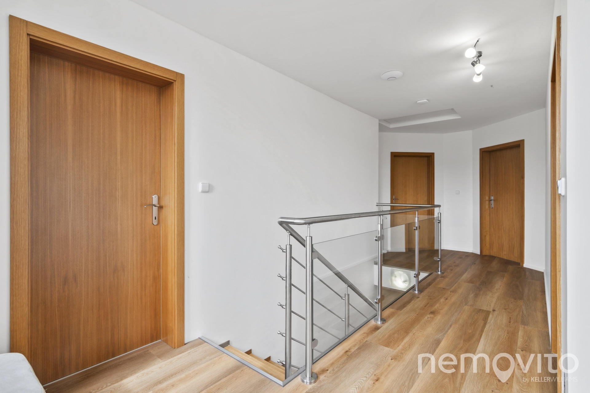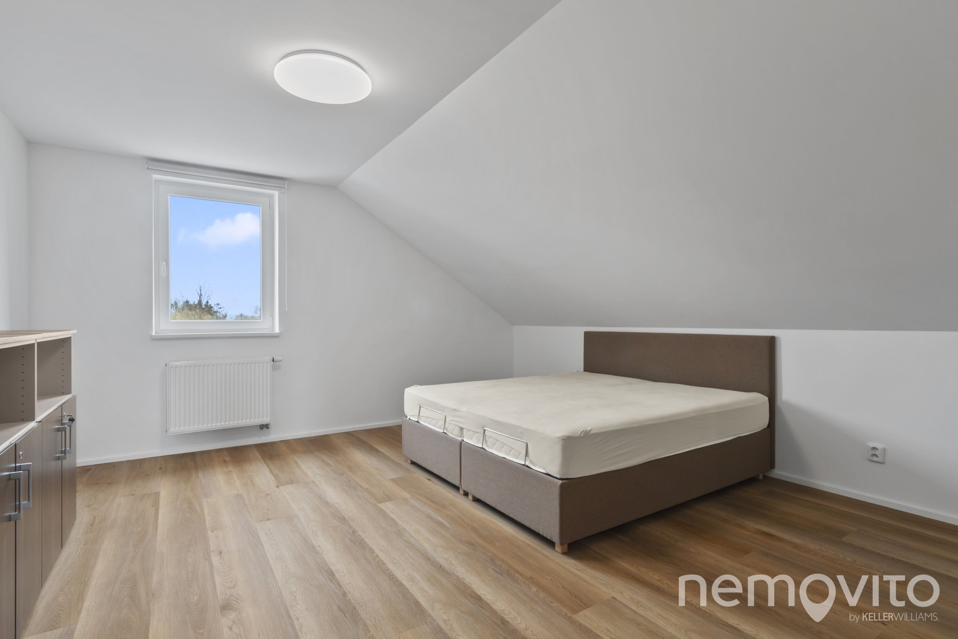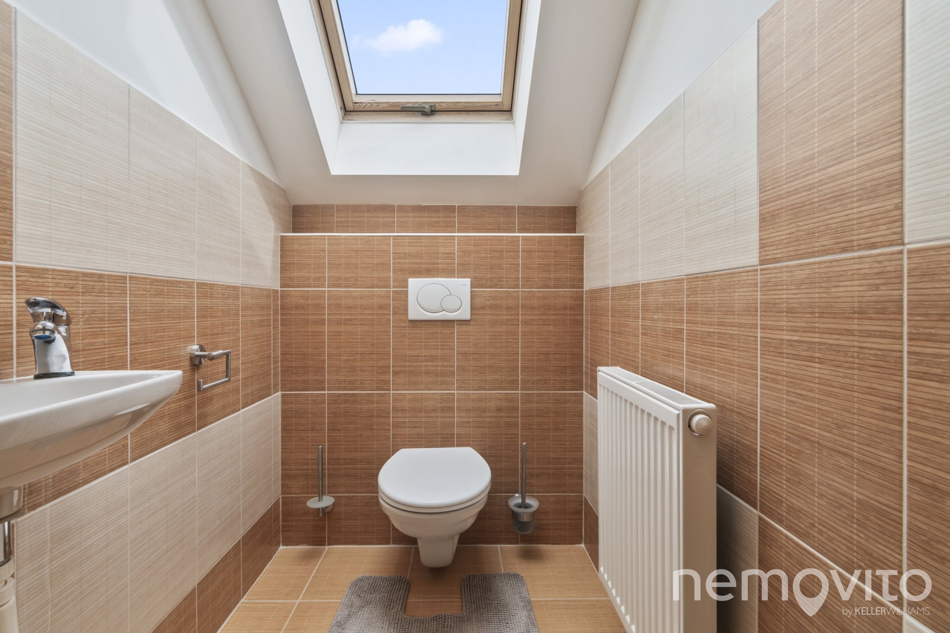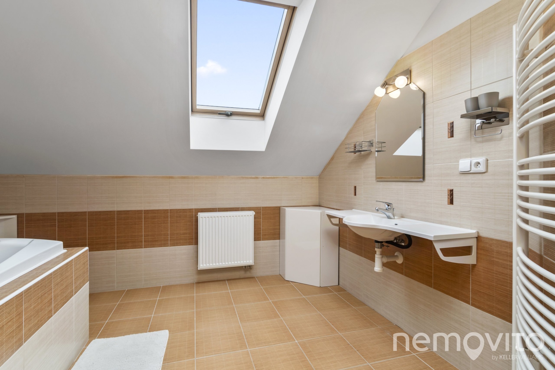 V patře jsou tři ložnice, z toho dvě se šatnou, koupelna a samostatná toaleta.