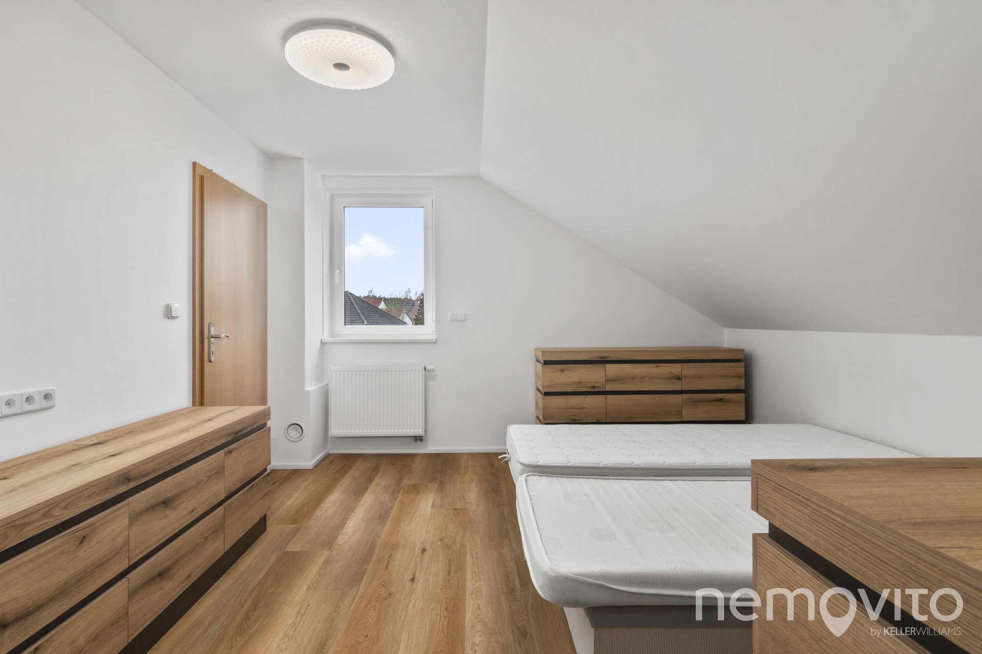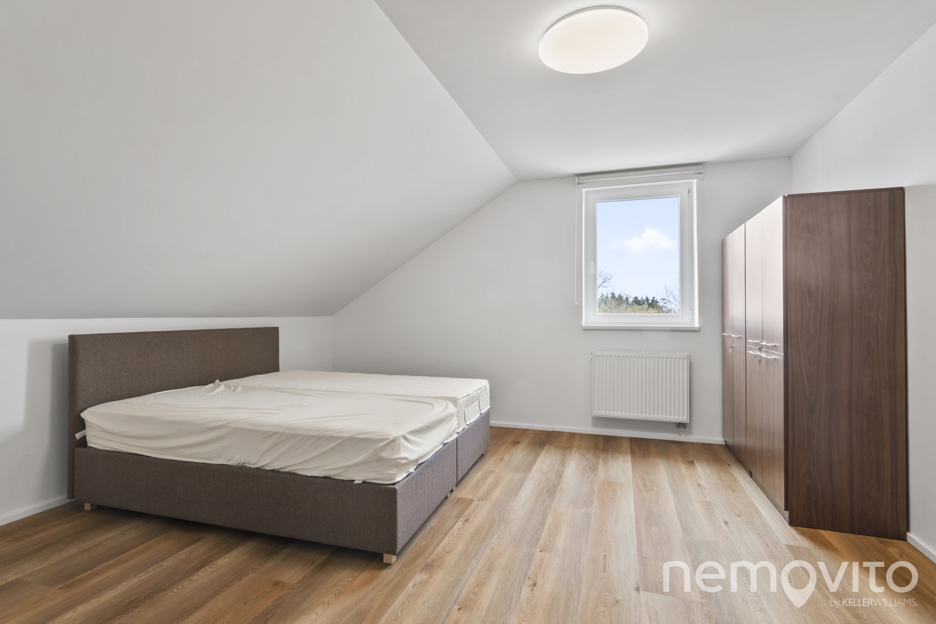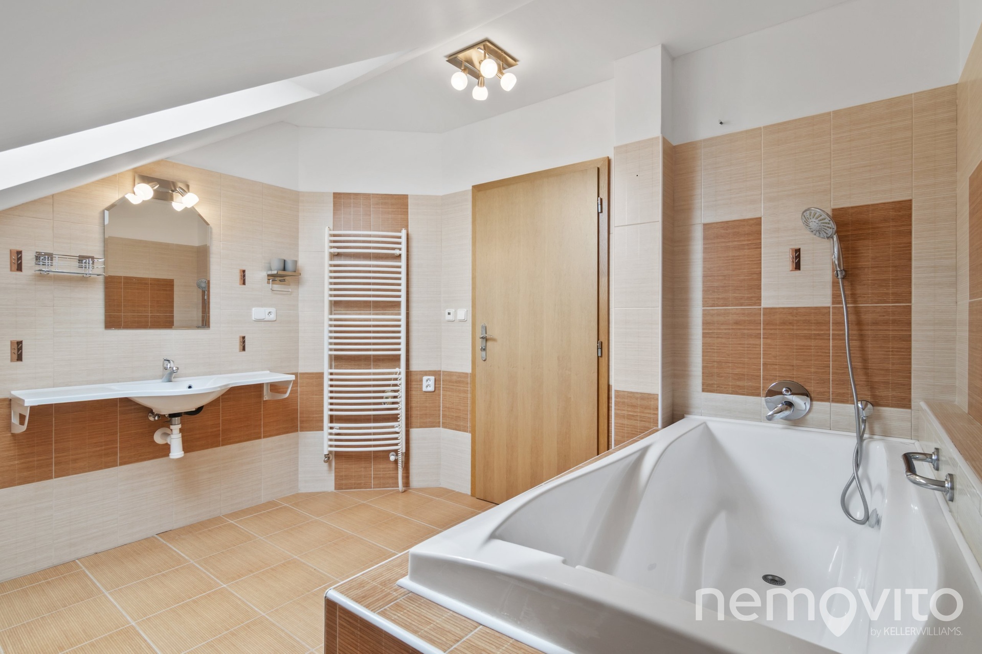 V patře jsou tři ložnice, z toho dvě se šatnou, koupelna a samostatná toaleta.