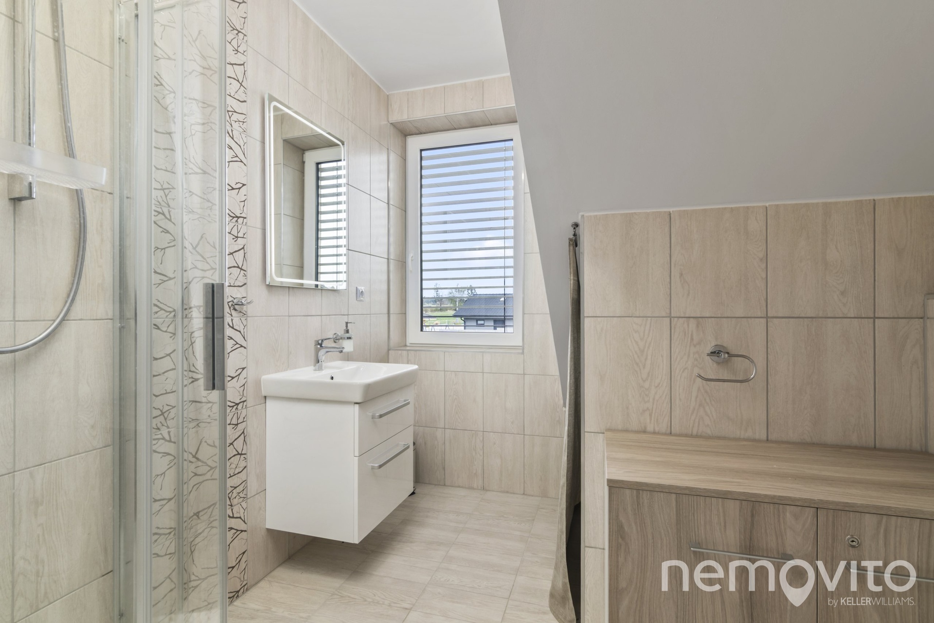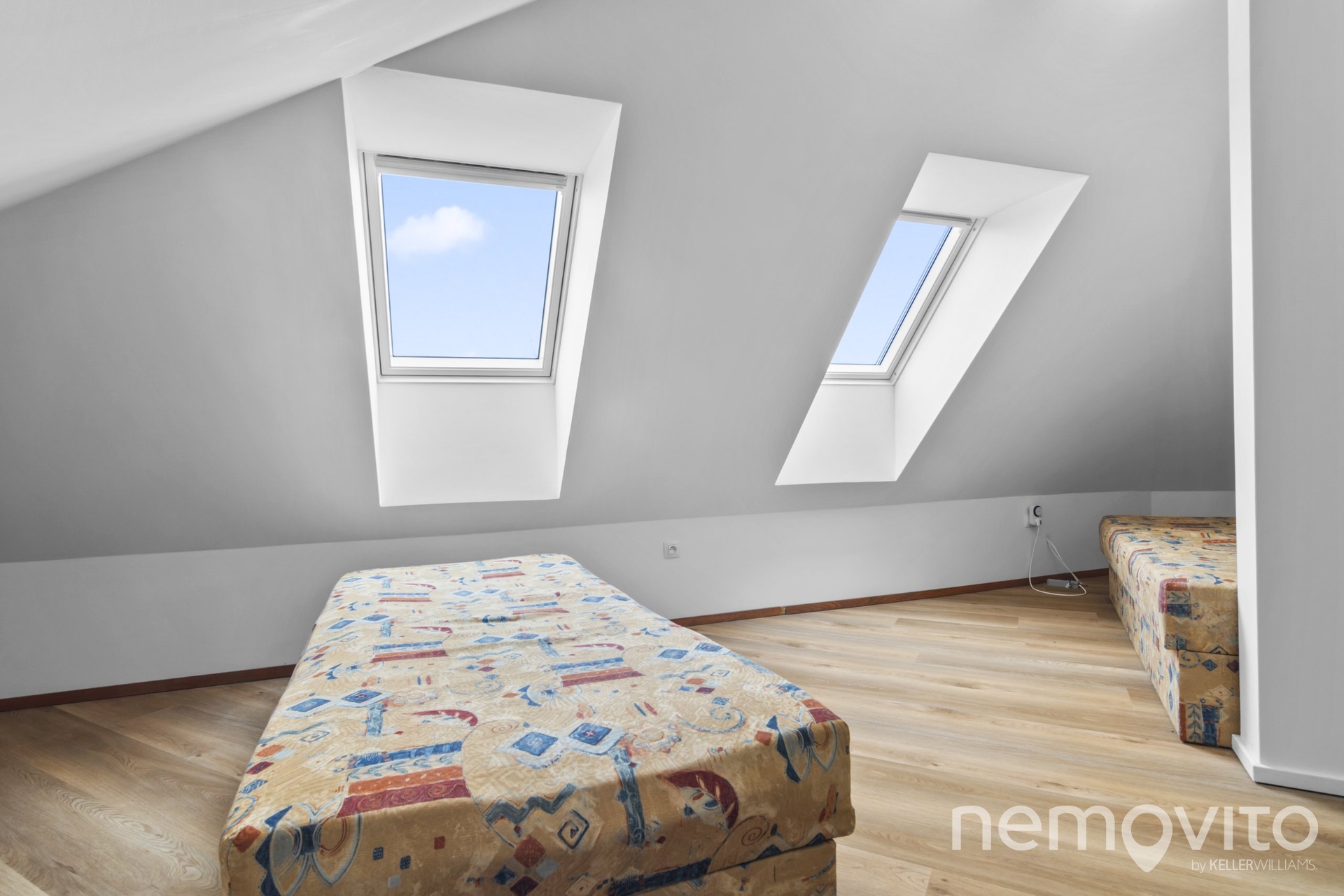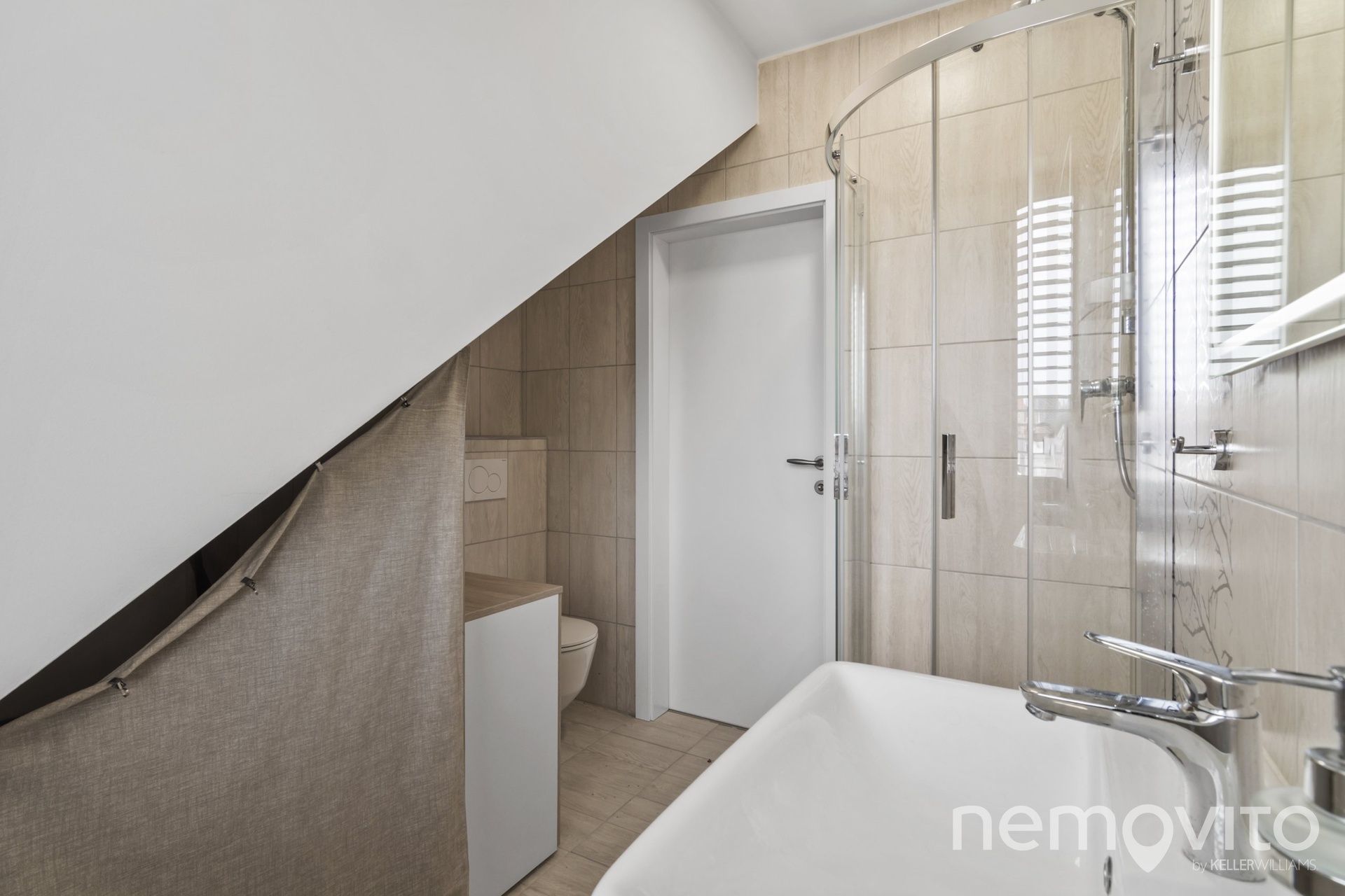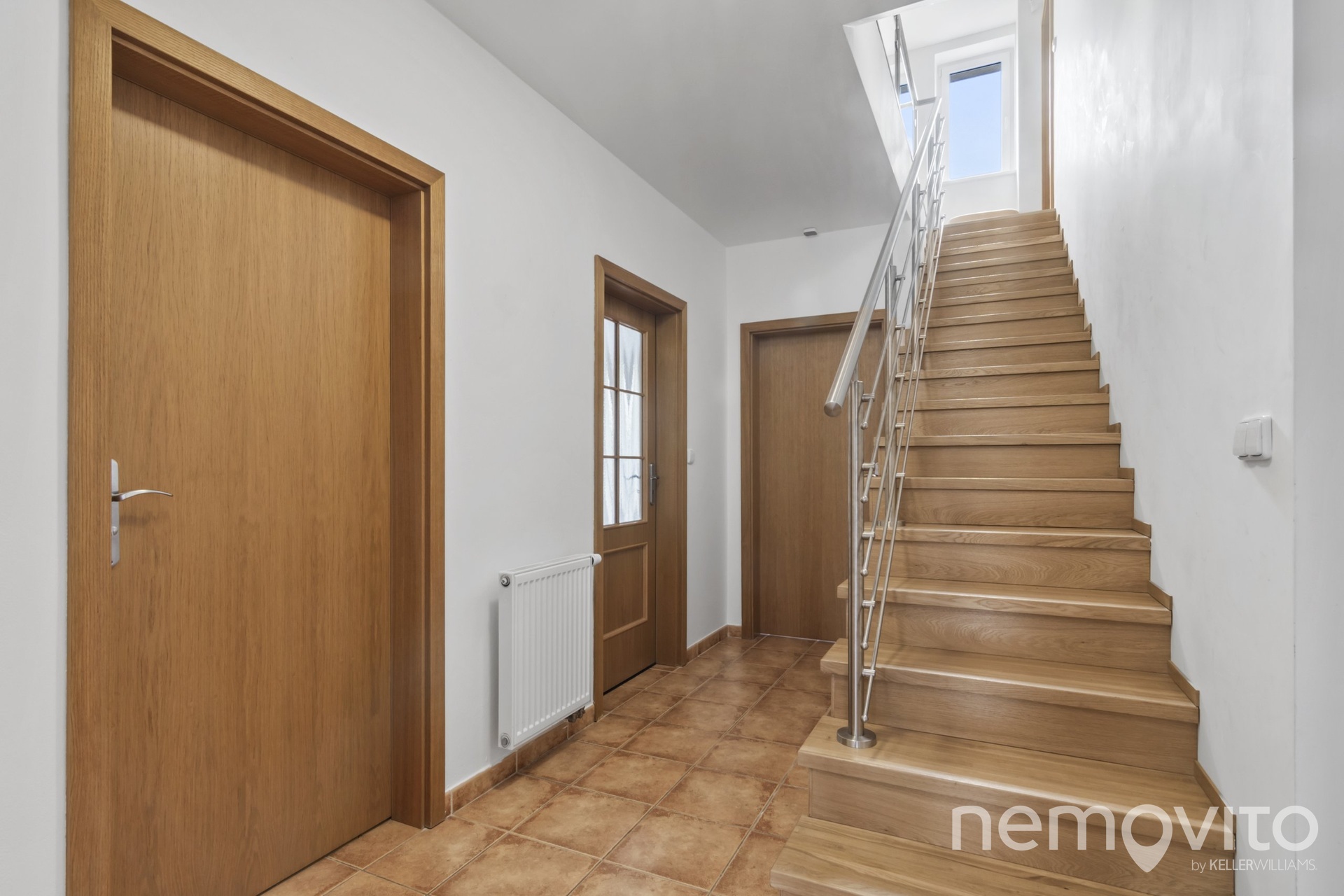 V patře jsou tři ložnice, z toho dvě se šatnou, koupelna a samostatná toaleta.