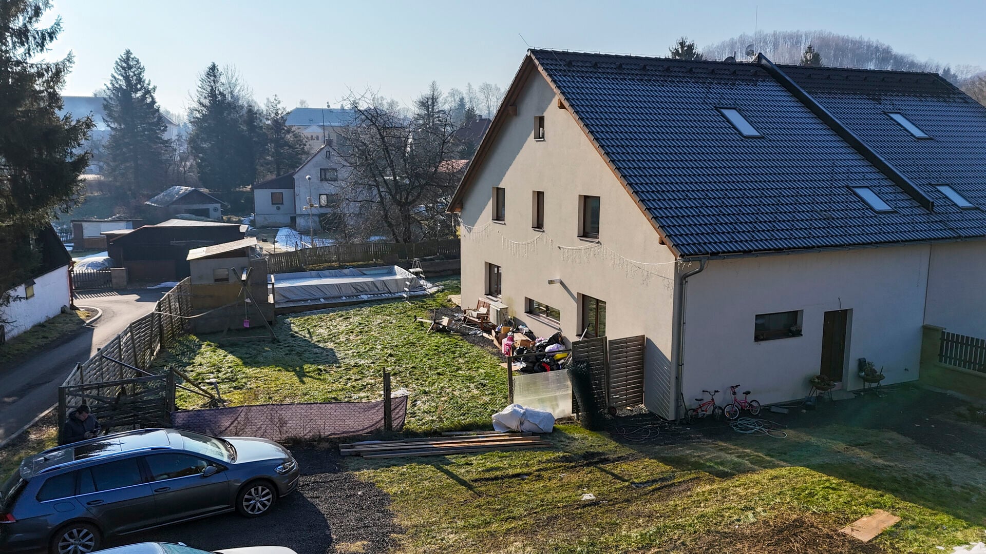 Na pozemku o výměře 709 m² se nachází zahrada s prostornou terasou, bazénem, dětským hradem a dřevěnou pergolou. Nemovitost disponuje pohodlným parkovacím stáním minimálně pro tři vozidla. Oplocený pozemek poskytuje soukromí a bezpečný prostor pro děti i domácí mazlíčky.
