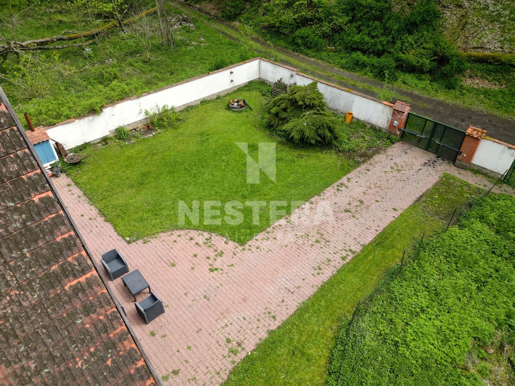 Pozemky o výměře 390 m² zahrnují oplocený dvůr ideální k posezení, přístup k potoku a prostor pro zahradničení.