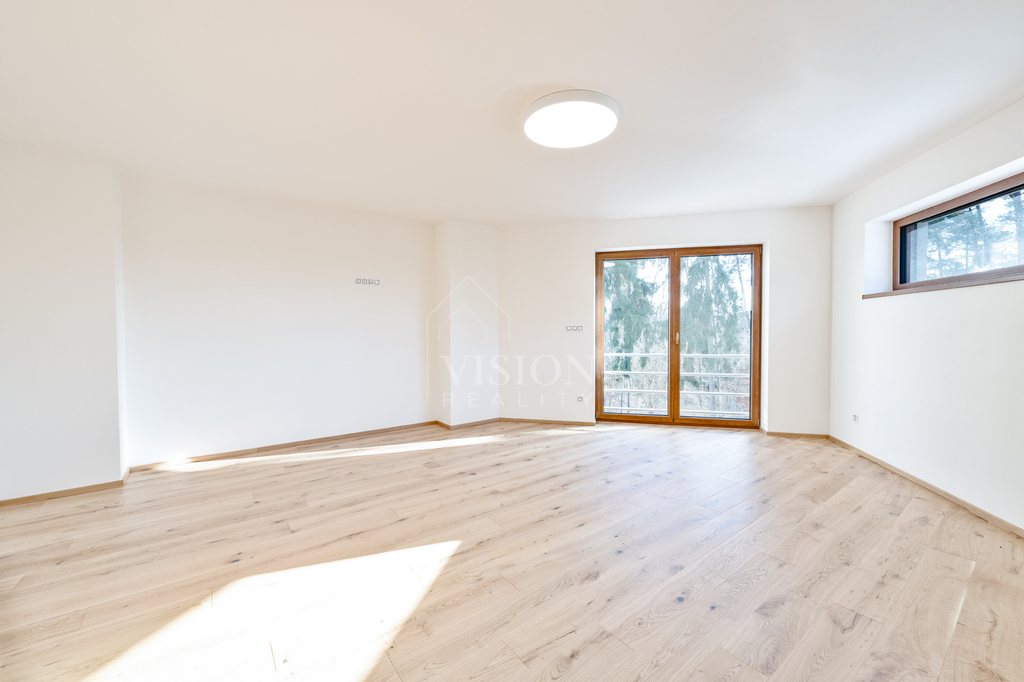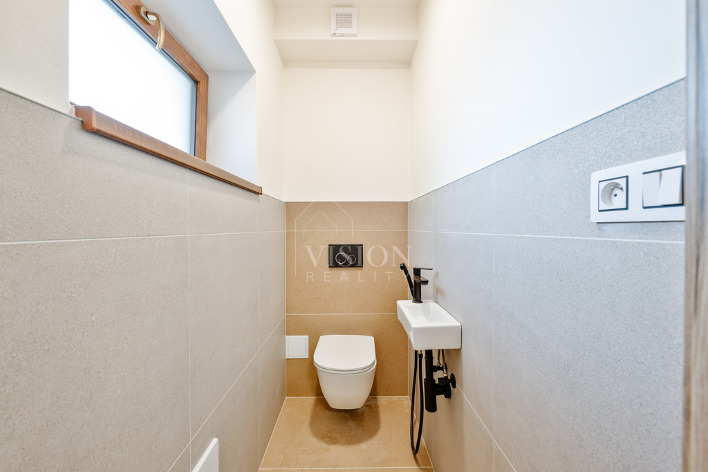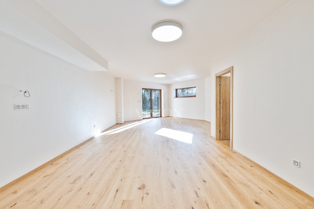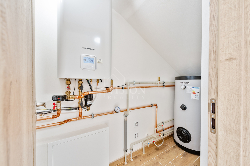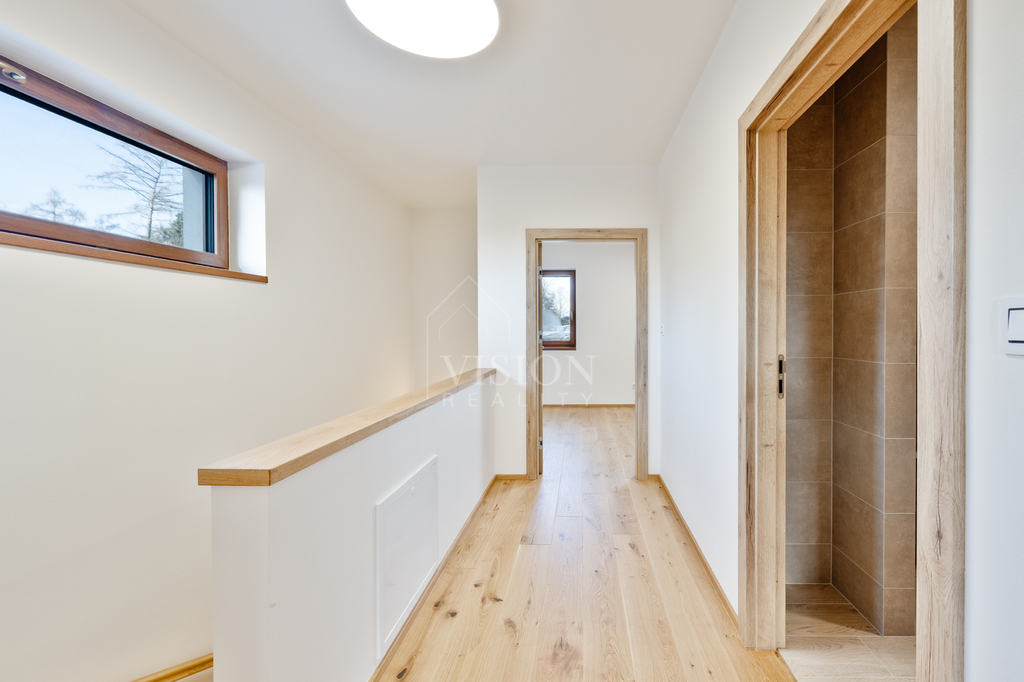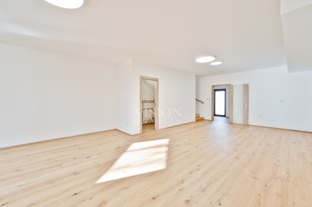 Ve spodním patře prostorný obývací pokoj s kuchyní a vstupem na zahradu, vstupní hala, wc a spíž, horním patře dva klidné pokoje a moderní koupelna s velkoformátovou dlažbou.