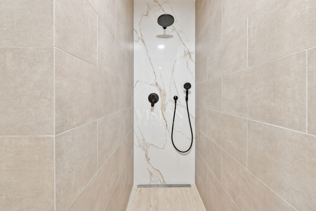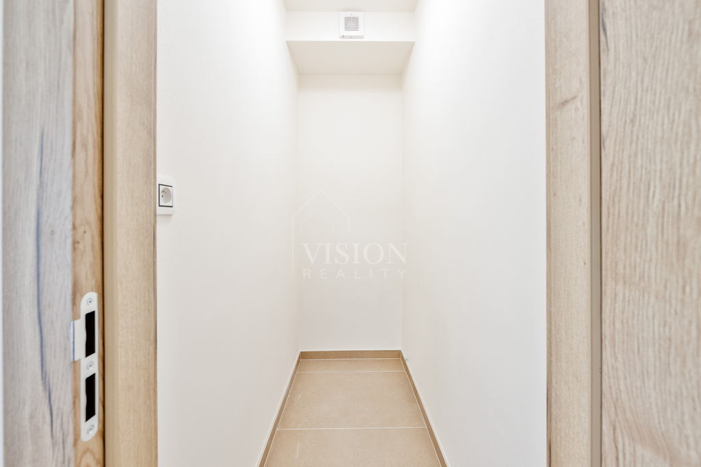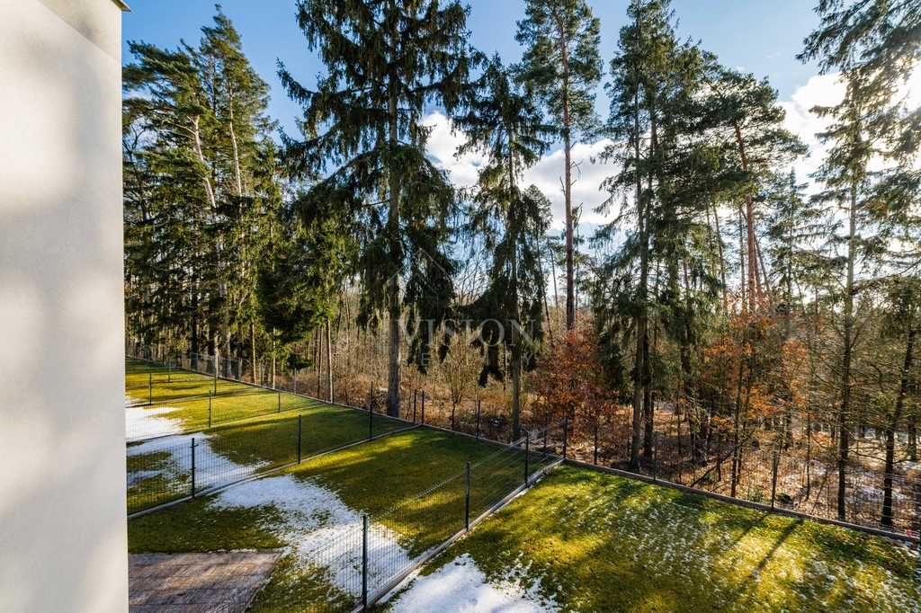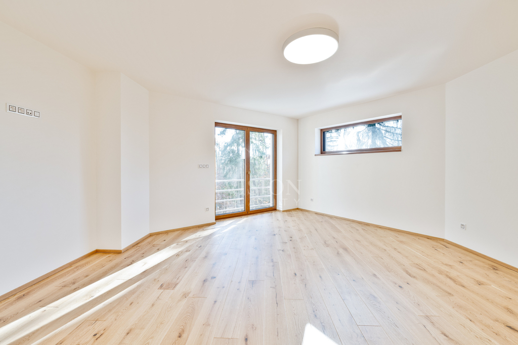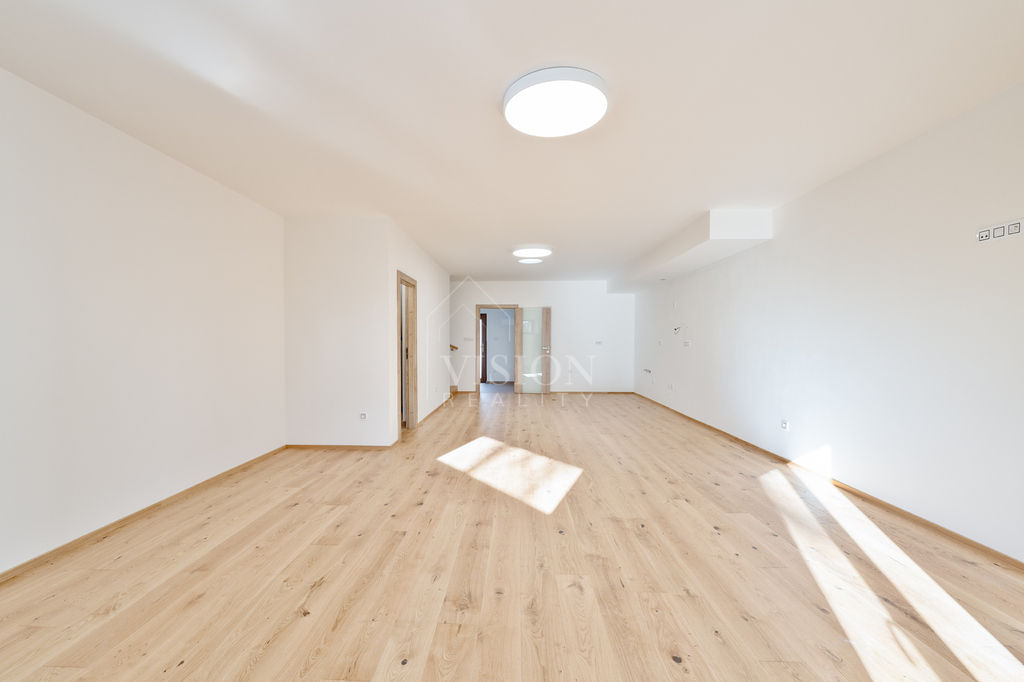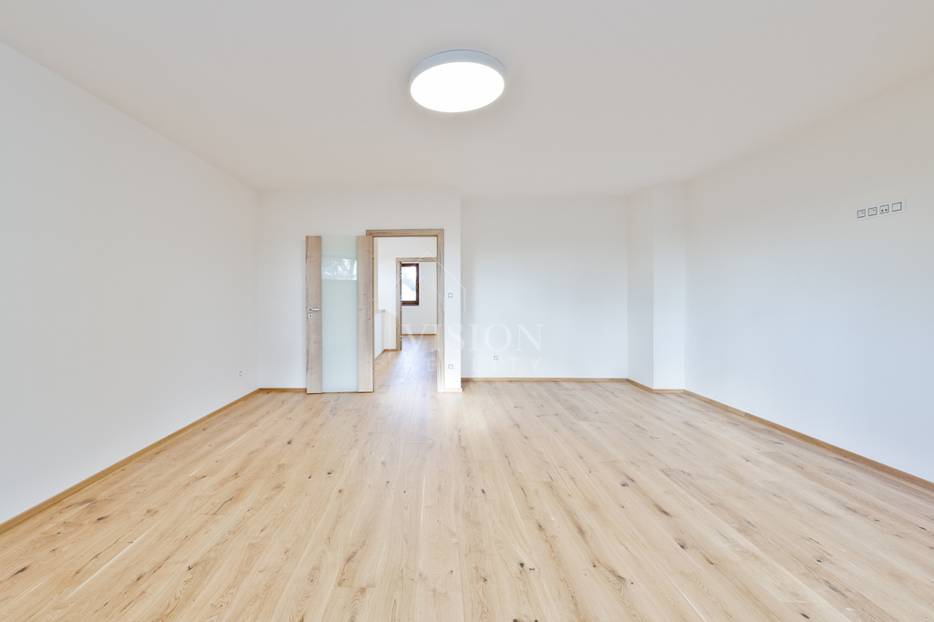 Ve spodním patře prostorný obývací pokoj s kuchyní a vstupem na zahradu, vstupní hala, wc a spíž, horním patře dva klidné pokoje a moderní koupelna s velkoformátovou dlažbou.