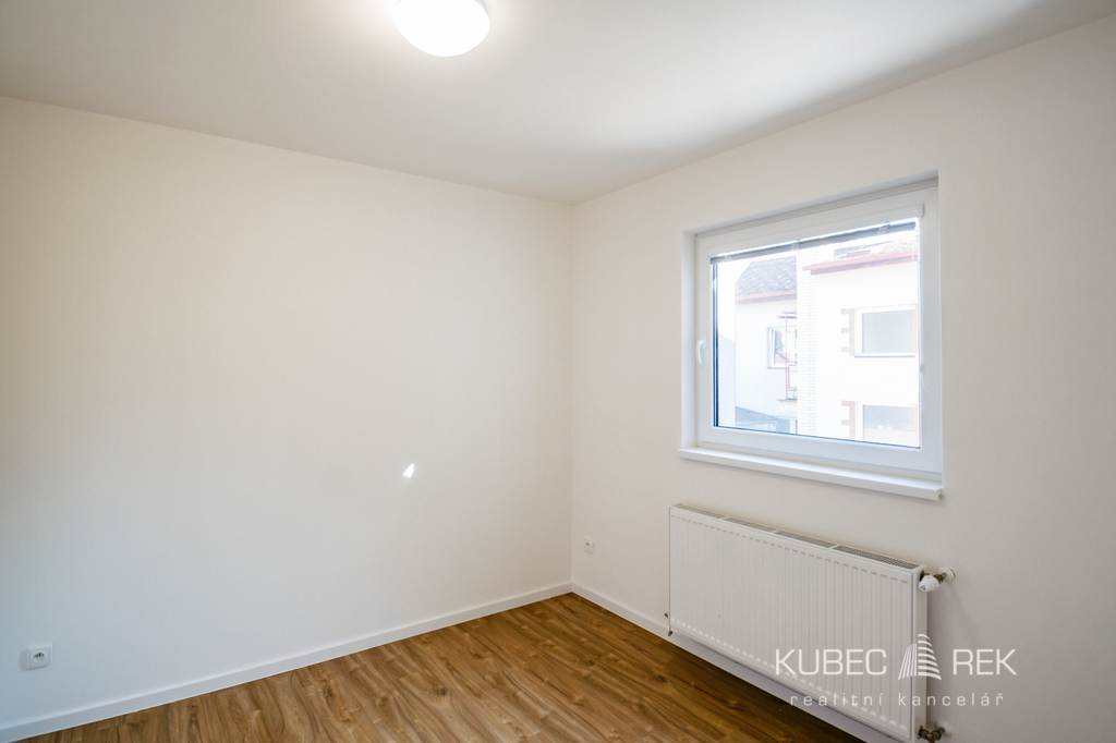 Byt je situován v 1. patře nového domu s energetickou náročností PENB C – tedy úsporné budovy. Dispozice zahrnuje vstupní chodbu, koupelnu, samostatné WC, ložnici, pokoj a obývací pokoj s kuchyňskou linkou včetně vestavných spotřebičů. Samozřejmostí je indukční deska, myčka, horkovzdušná trouba a digestoř. K bytu náleží také sklep o velikosti cca 2 m².