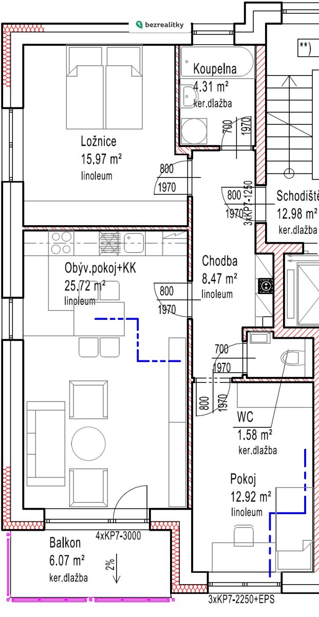 Byt je navržen s důrazem na komfort, prostor a světlo. Dispozice nabízí prostorný obývací pokoj s kuchyňským koutem, dvě samostatné ložnice, koupelnu s vanou a balkon, ze kterého se otevírá krásný, ničím nerušený výhled. Díky tomu, že jsou na každém patře pouze dva byty, si zde užijete klid a dostatek soukromí.
