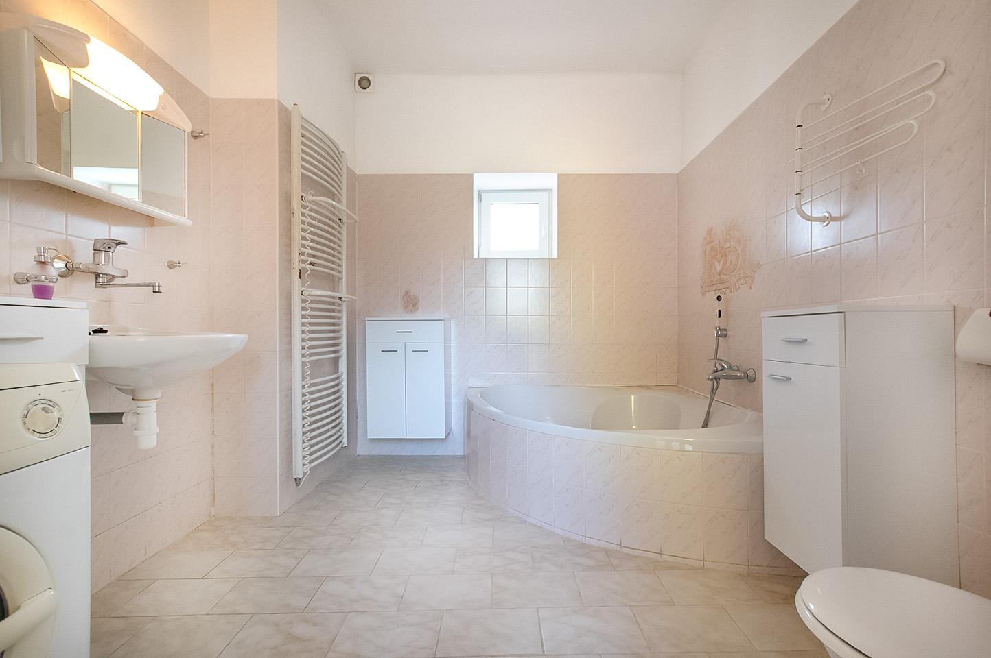 K dispozici jsou dvě koupelny a také velkorysý nebytový prostor stodolu /garáž/ se sekčními garážovými vraty o velikosti 148 m and sup2;, který lze využít pro podnikání, dílnu, sklad nebo další zázemí.