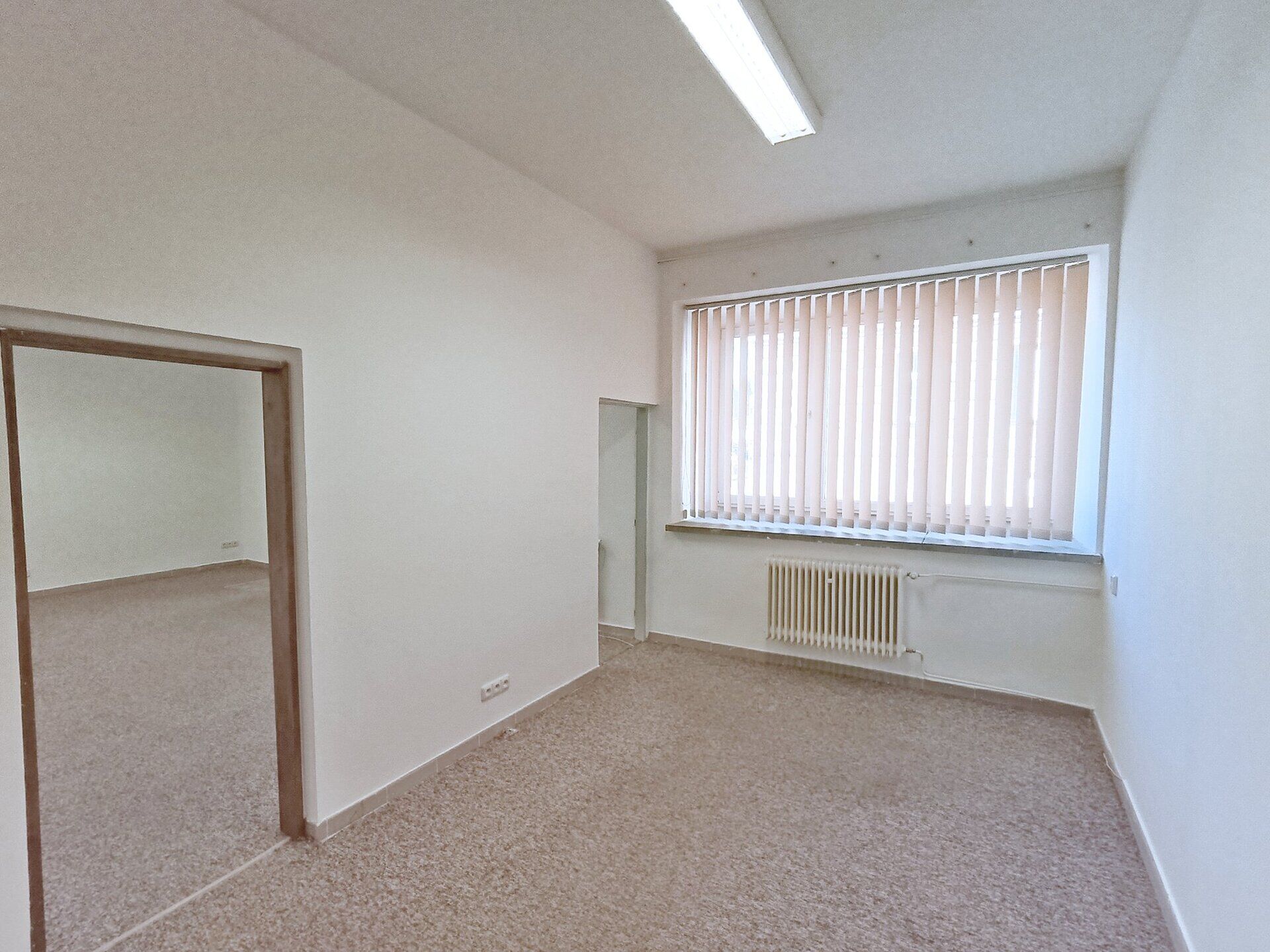 V zadní místnosti jsou na okně vertikální žaluzie. Na podlaze je položen koberec, pod ním je šedá dlažba.