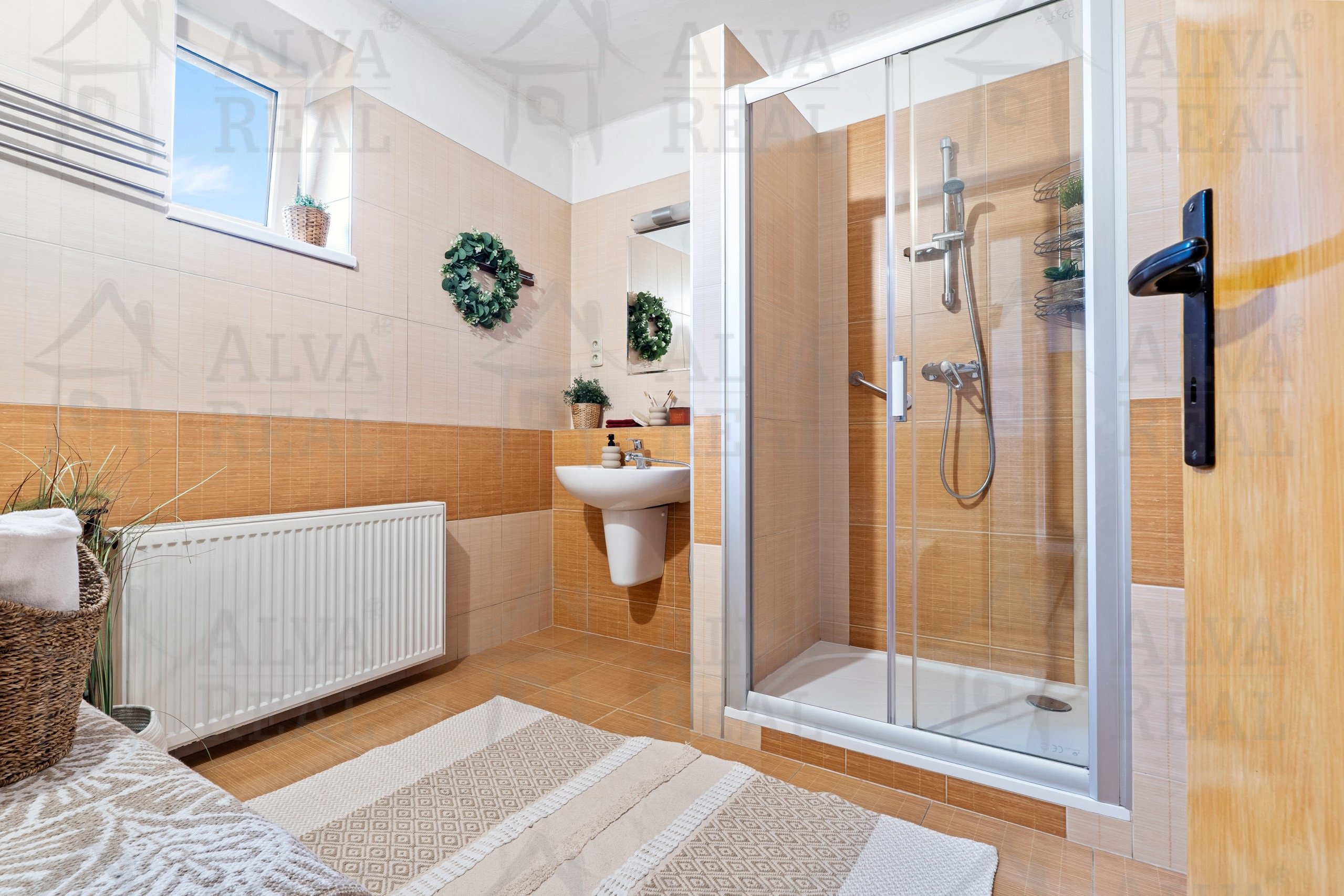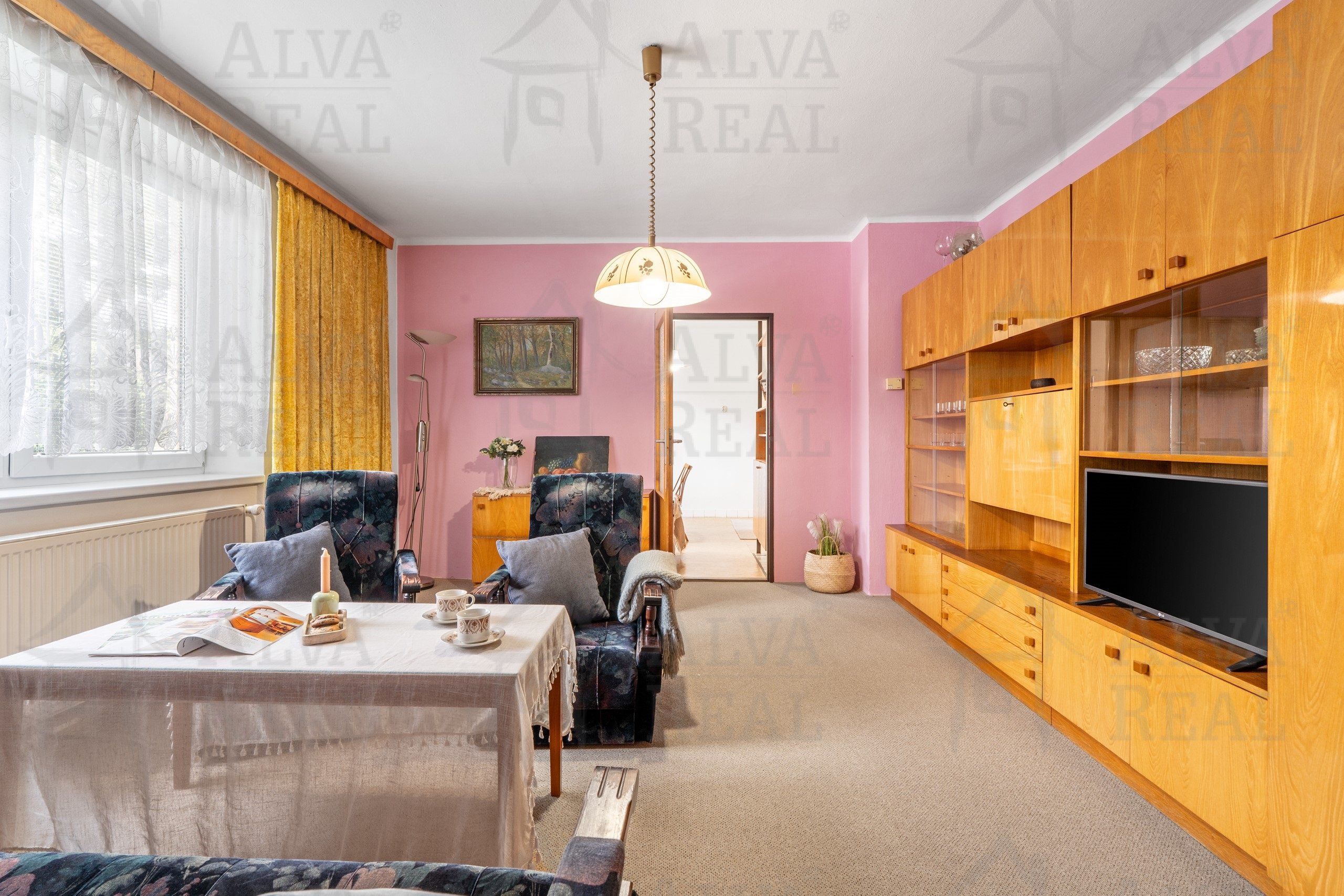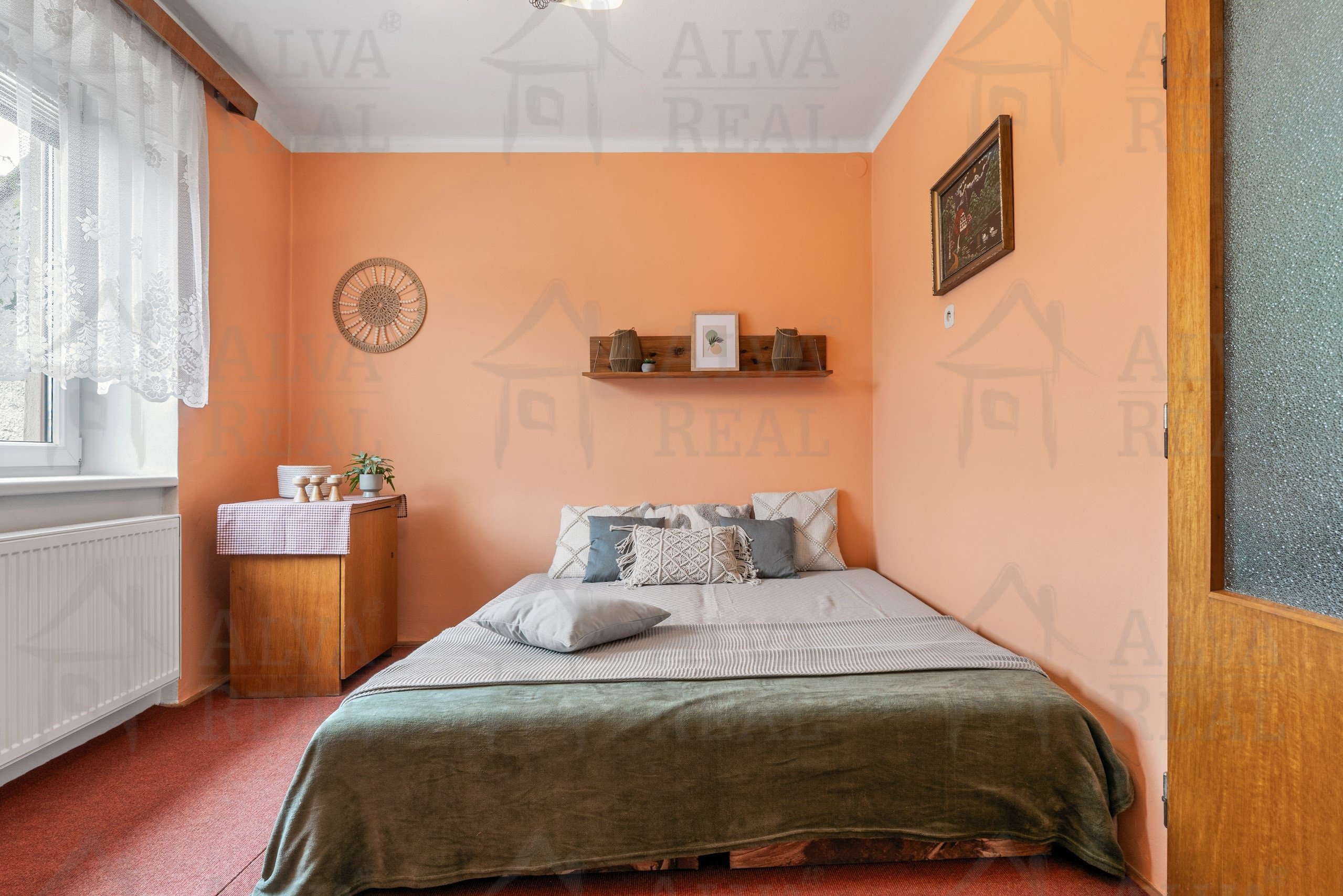 První patro, do kterého však díky částečné svažitosti pozemku, vede z předzahrádky pouze pár schodů, je tvořeno obytnou částí. Nachází se zde 3 ložnice / pokoje, z nichž jeden je průchozí, prostorný obývací pokoj, kuchyně s jídelnou a spíž. Dále také samostatné WC a koupelna se zděným sprchovým koutem.