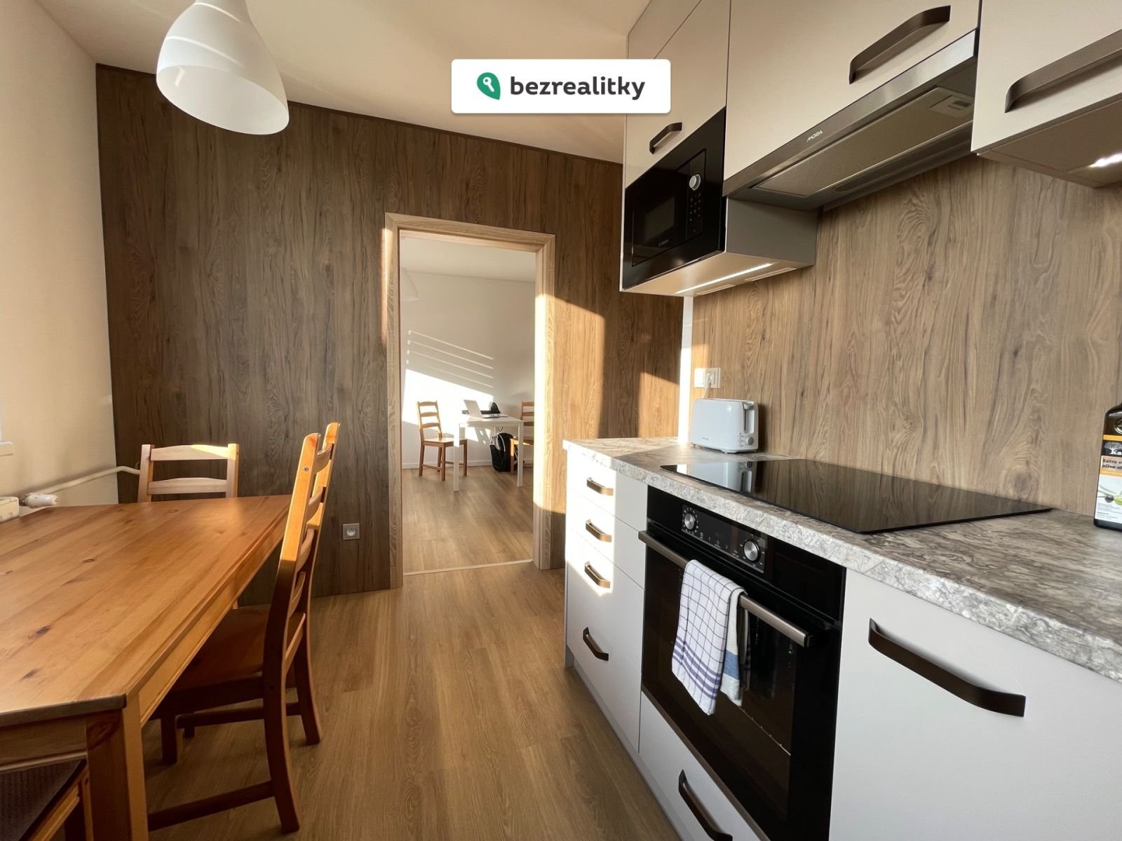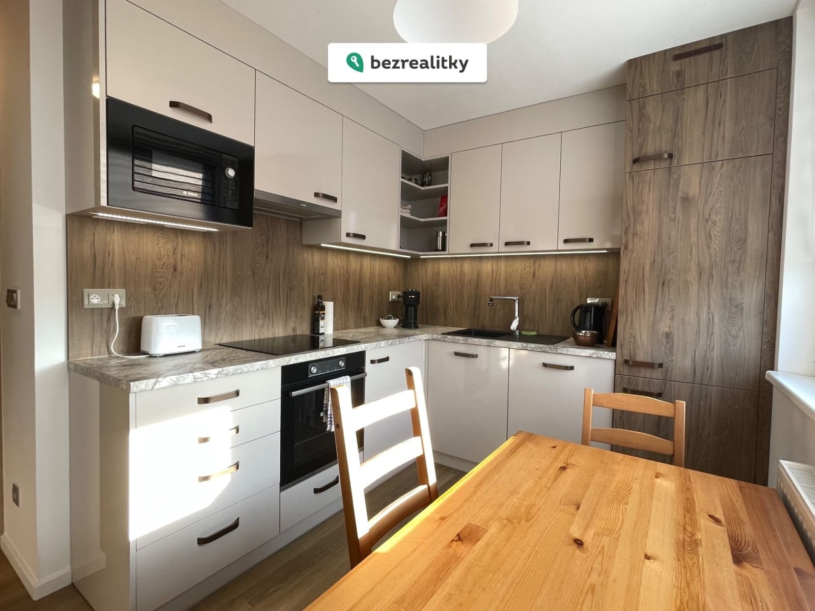 - kuchyň vybavenou vestavnými spotřebiči (indukční varná deska, horkovzdušná trouba, mikrovlnná trouba, lednice s mrazákem). Orientace místnosti na západ.