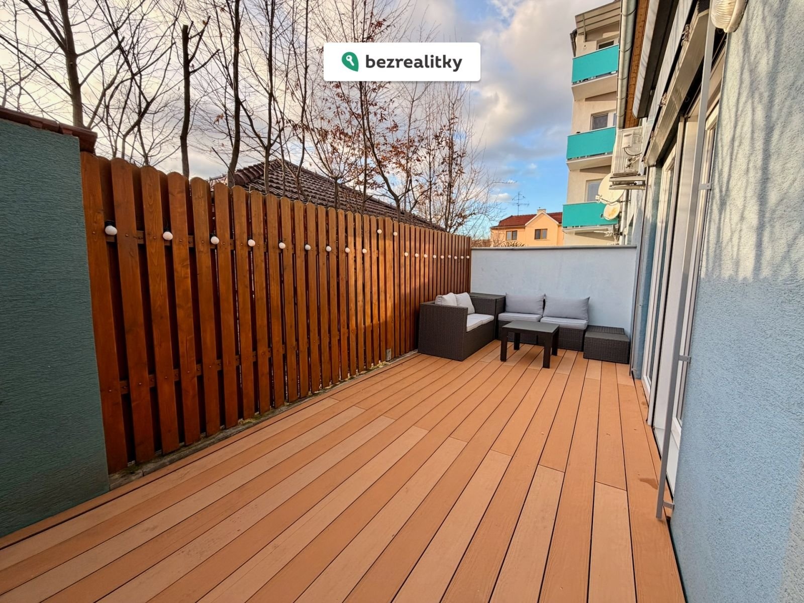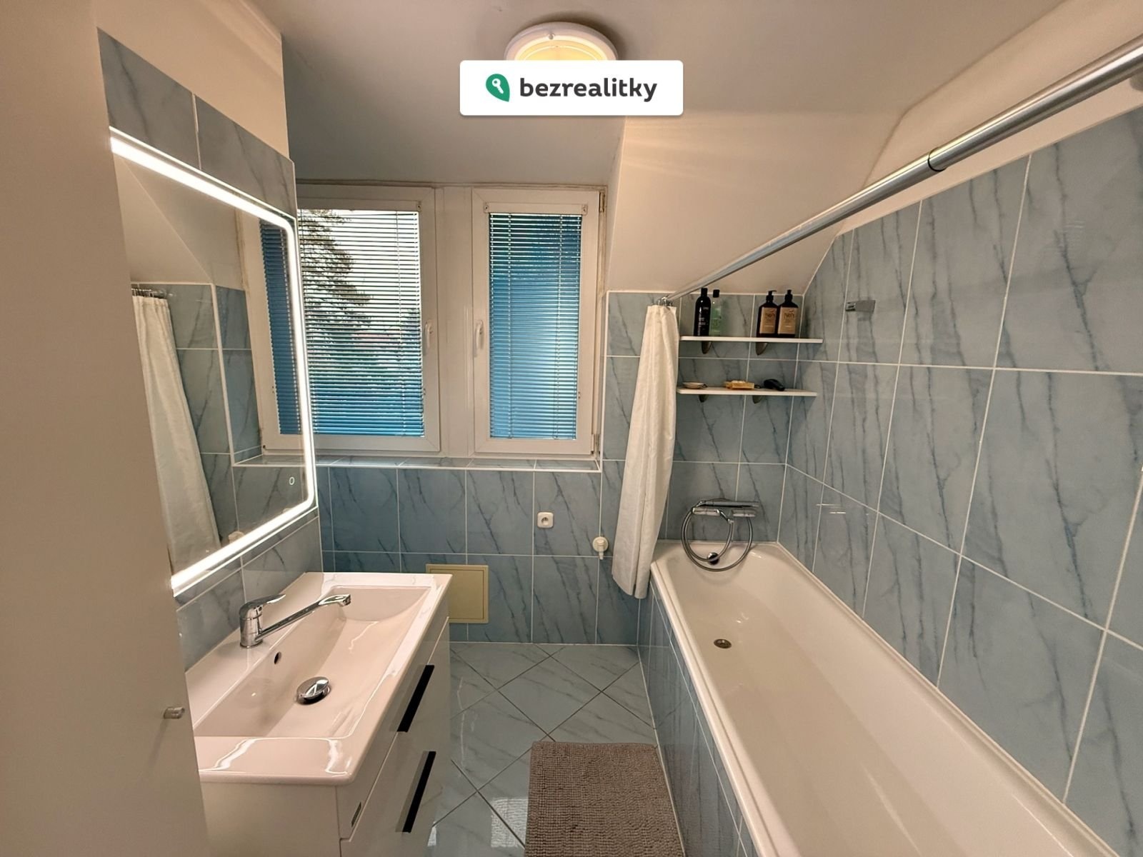 • První patro: Prostorná ložnice (29 m²) a koupelna s vanou a toaletou. Z chodby i z ložnice se dostanete na druhou velkou terasu (20 m²), která zároveň slouží jako přístřešek pro auto.