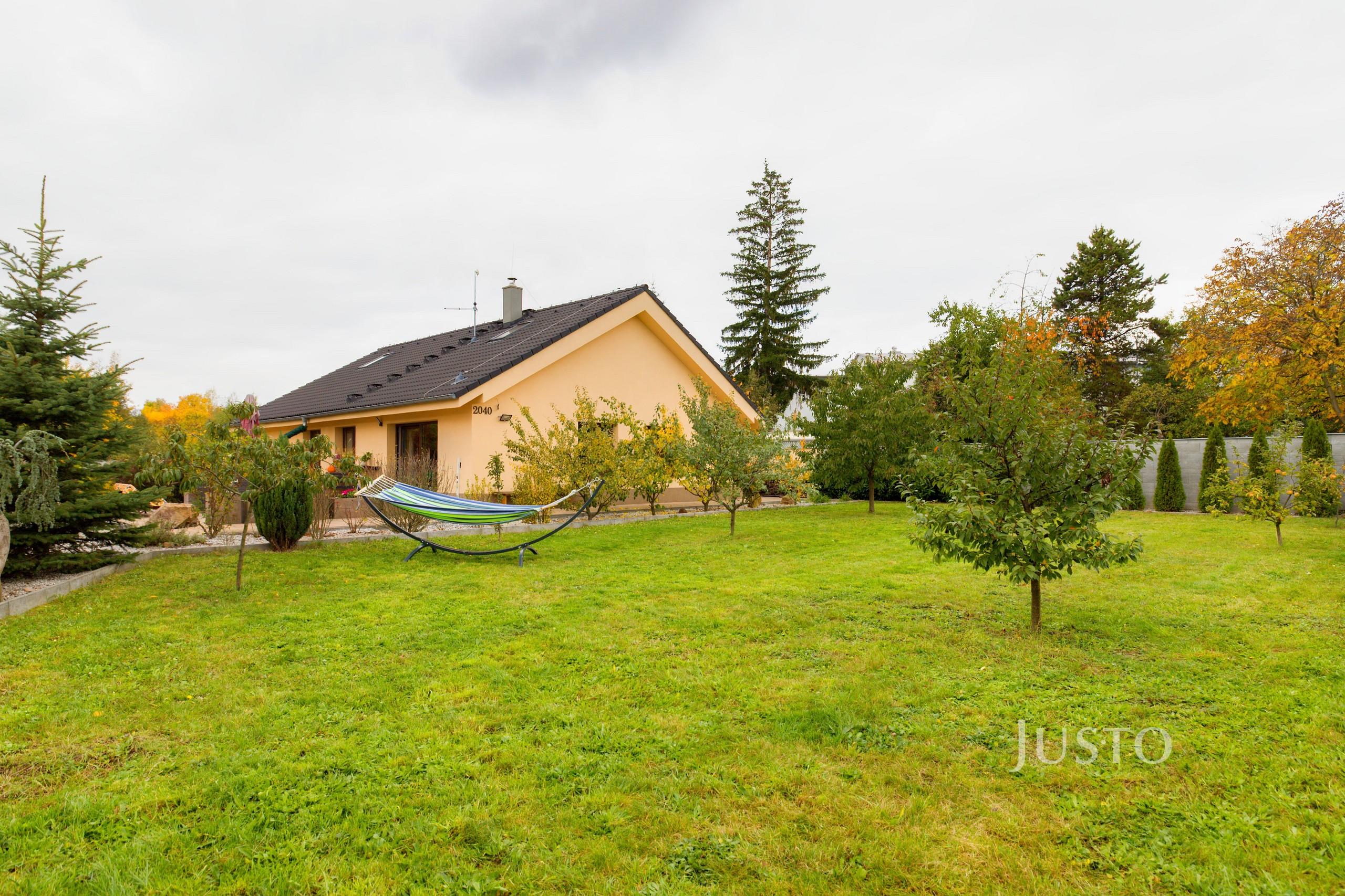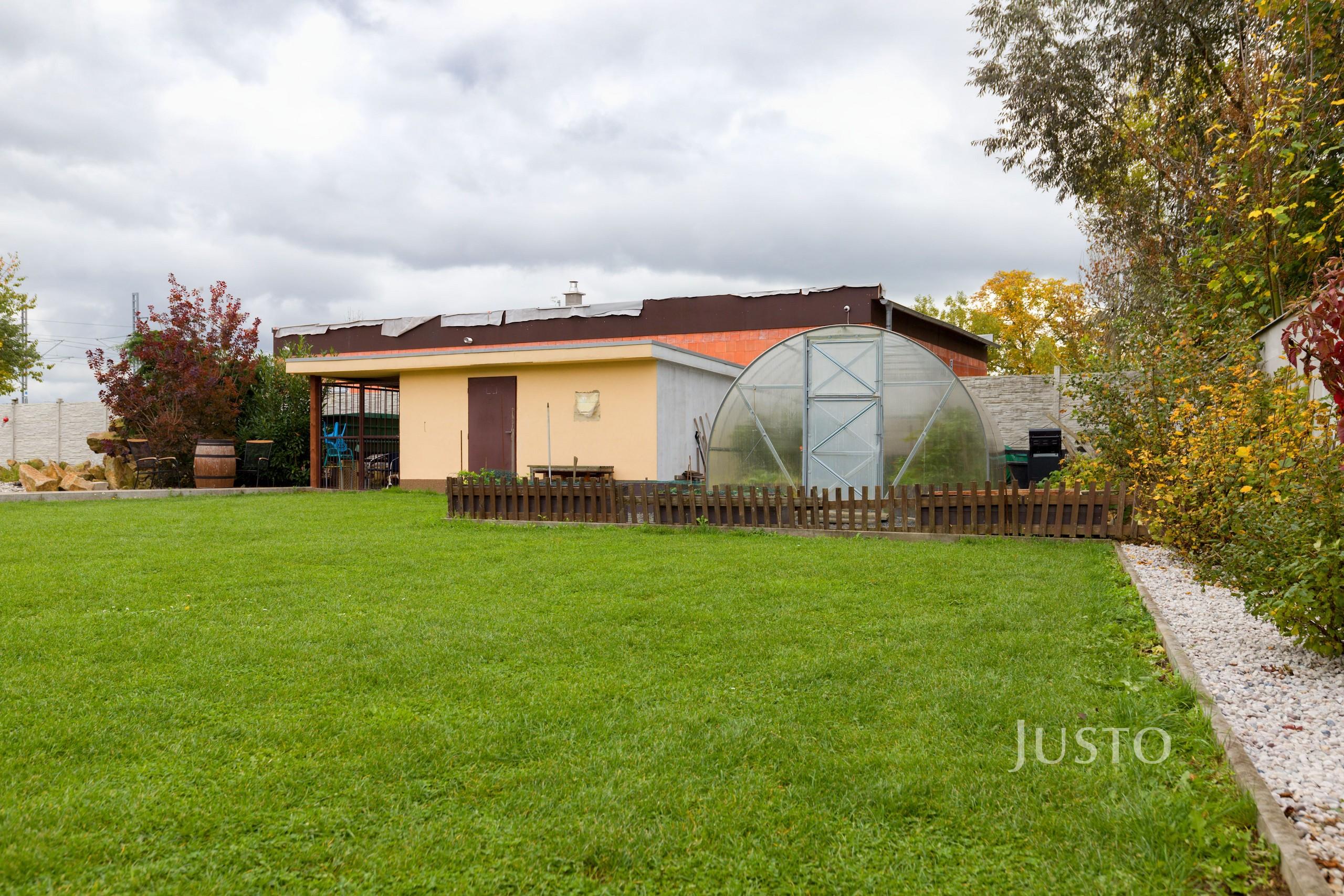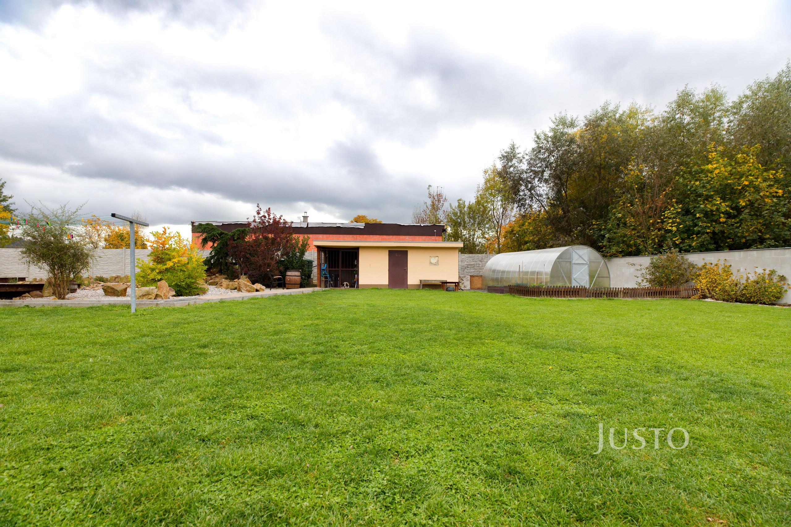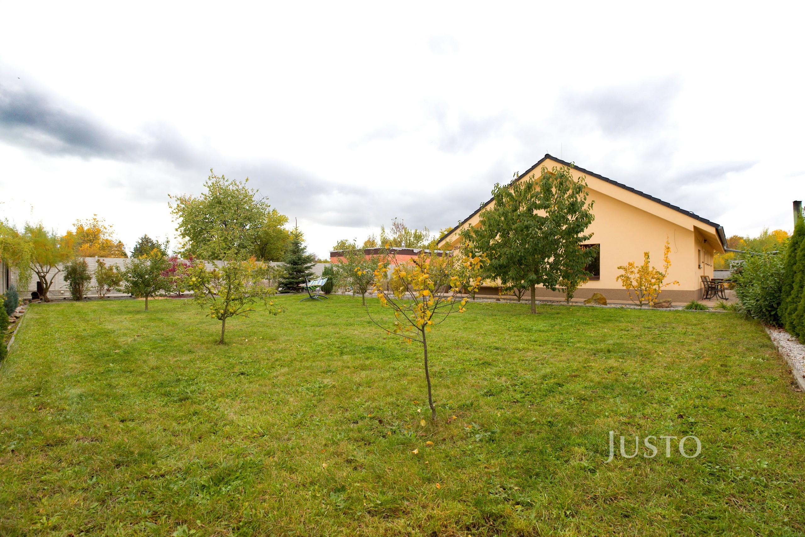 K domu náleží rozsáhlý vlastní pozemek o celkové rozloze 1819 m², z toho zahrada činí 1400 m². K dispozici je prostorná terasa, která je přímo propojena s obývacím prostorem velkými francouzskými okny, což podtrhuje propojení interiéru s exteriérem. Na pozemku je připraveno parkování až pro 4 vozy, celý prostor je oplocen a situován v klidné části obce.
