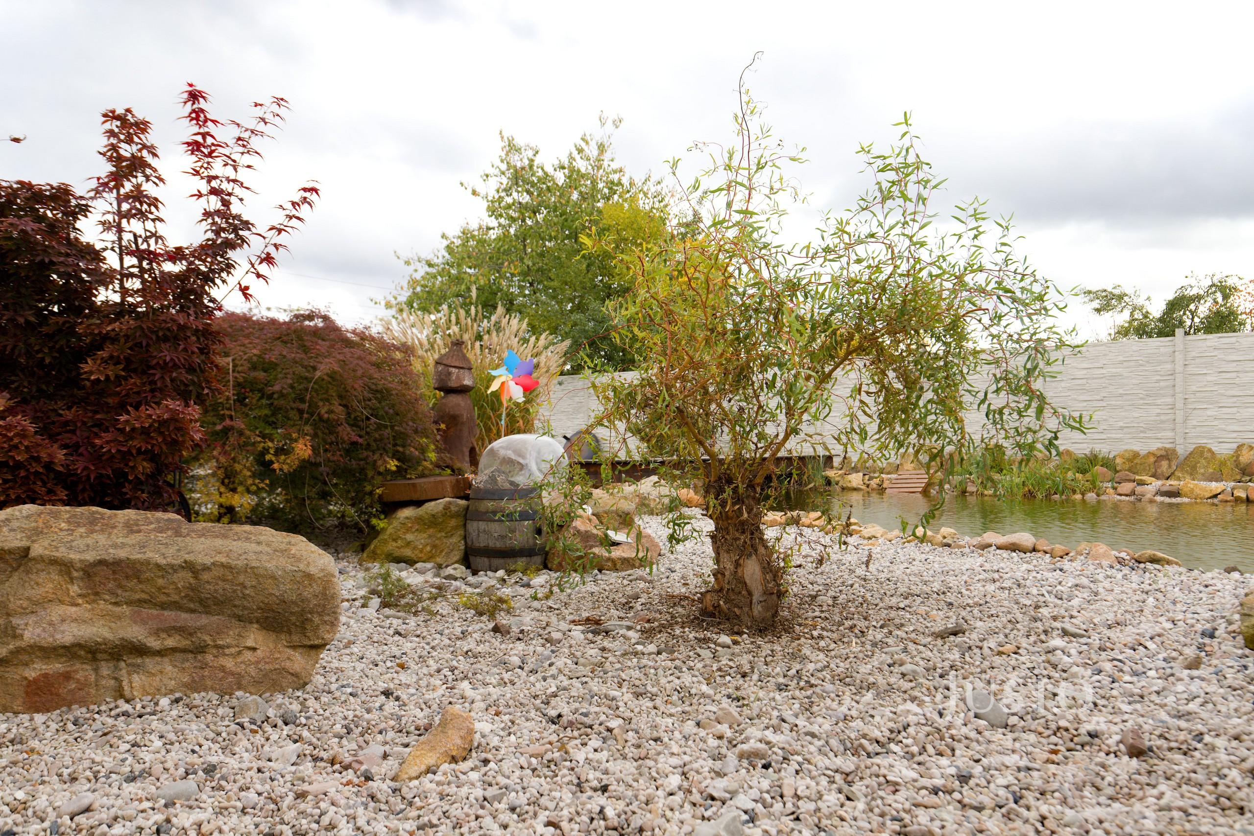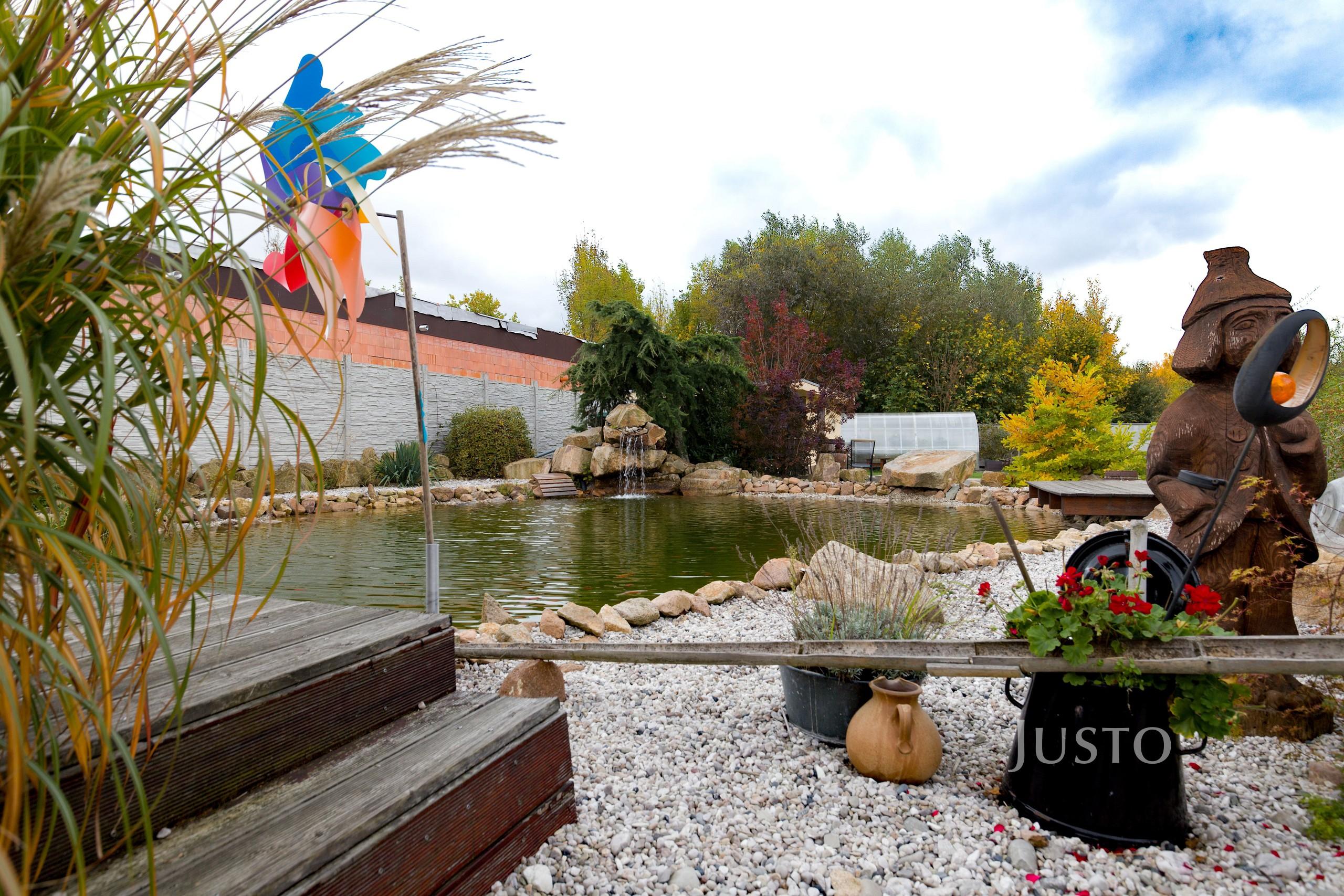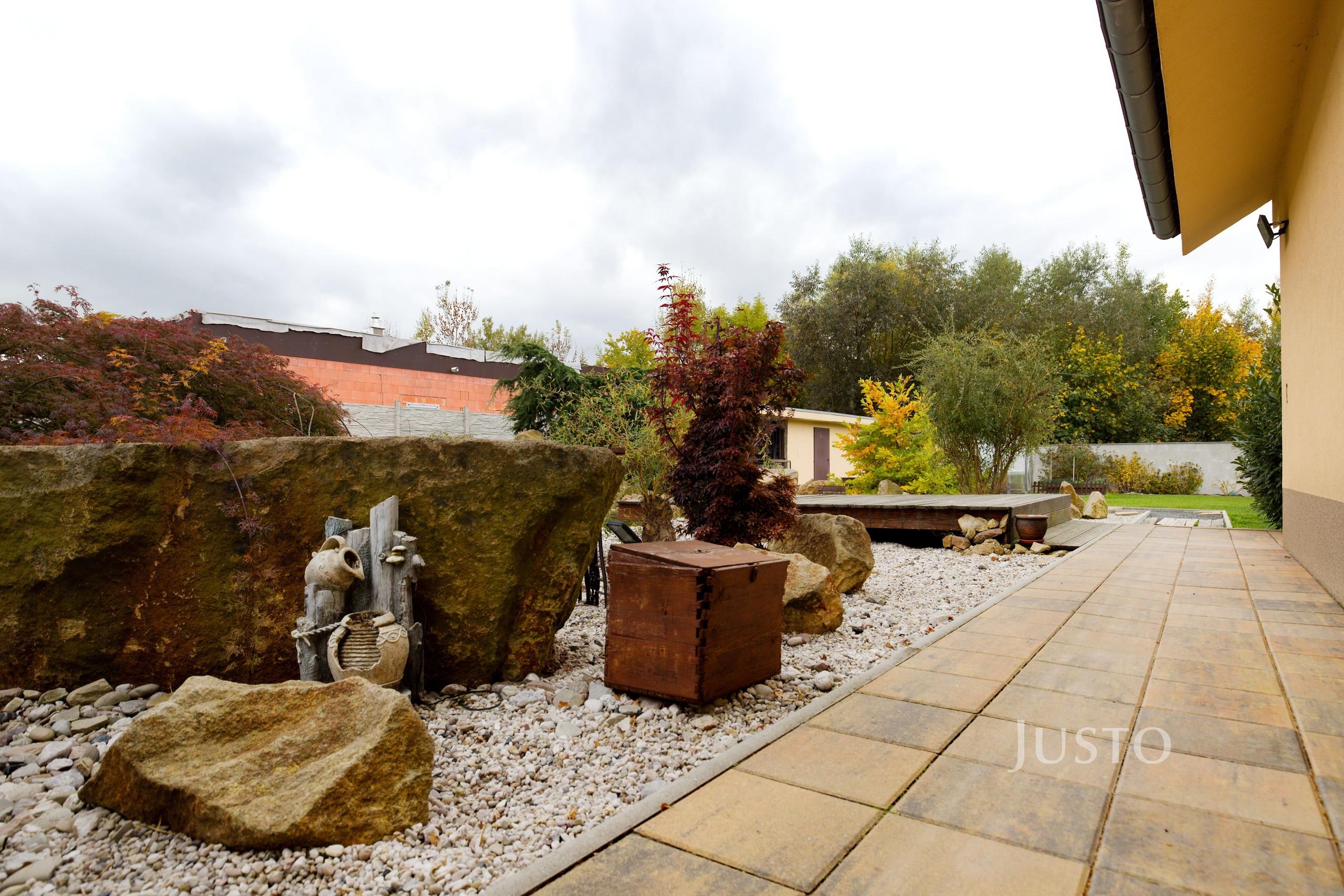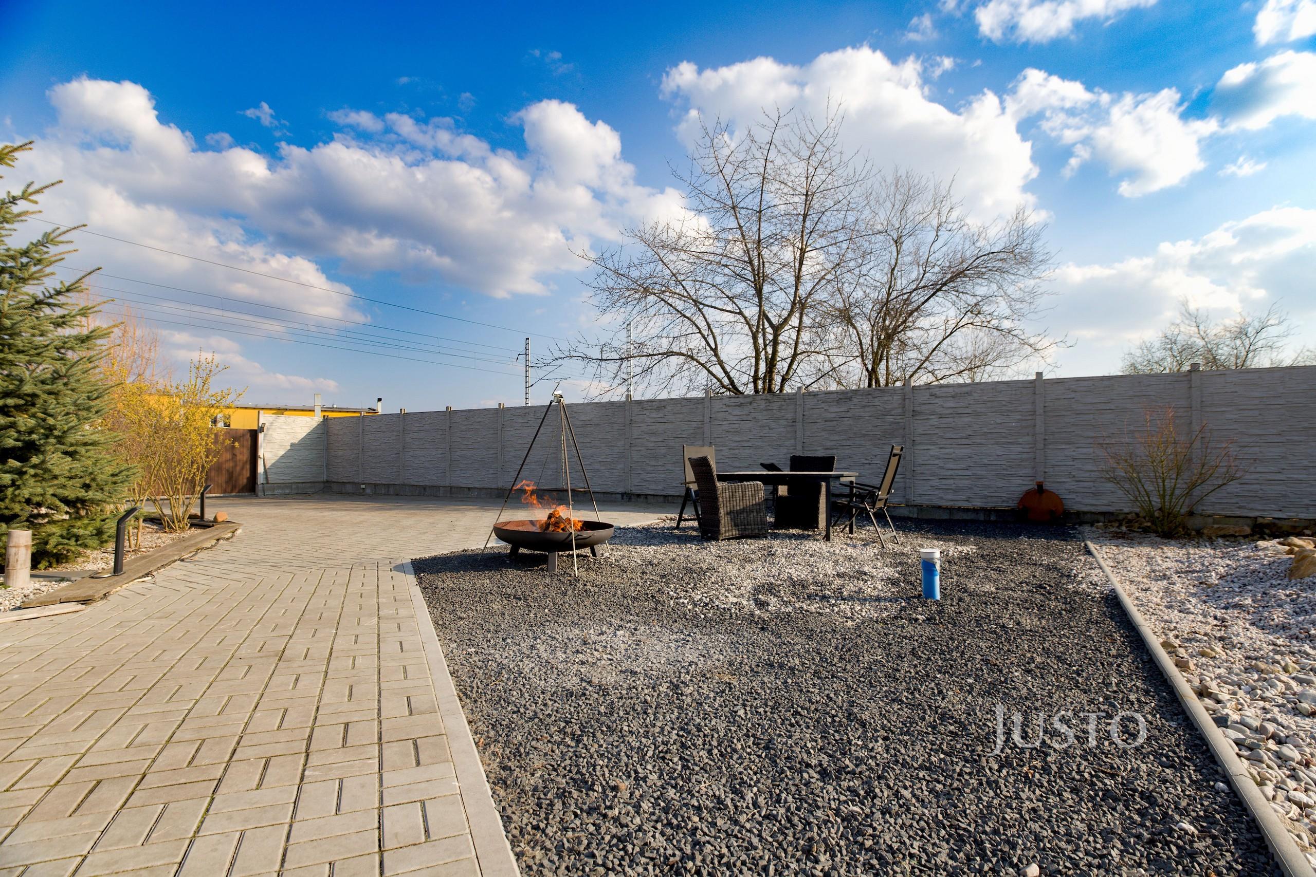 K domu náleží rozsáhlý vlastní pozemek o celkové rozloze 1819 m², z toho zahrada činí 1400 m². K dispozici je prostorná terasa, která je přímo propojena s obývacím prostorem velkými francouzskými okny, což podtrhuje propojení interiéru s exteriérem. Na pozemku je připraveno parkování až pro 4 vozy, celý prostor je oplocen a situován v klidné části obce.