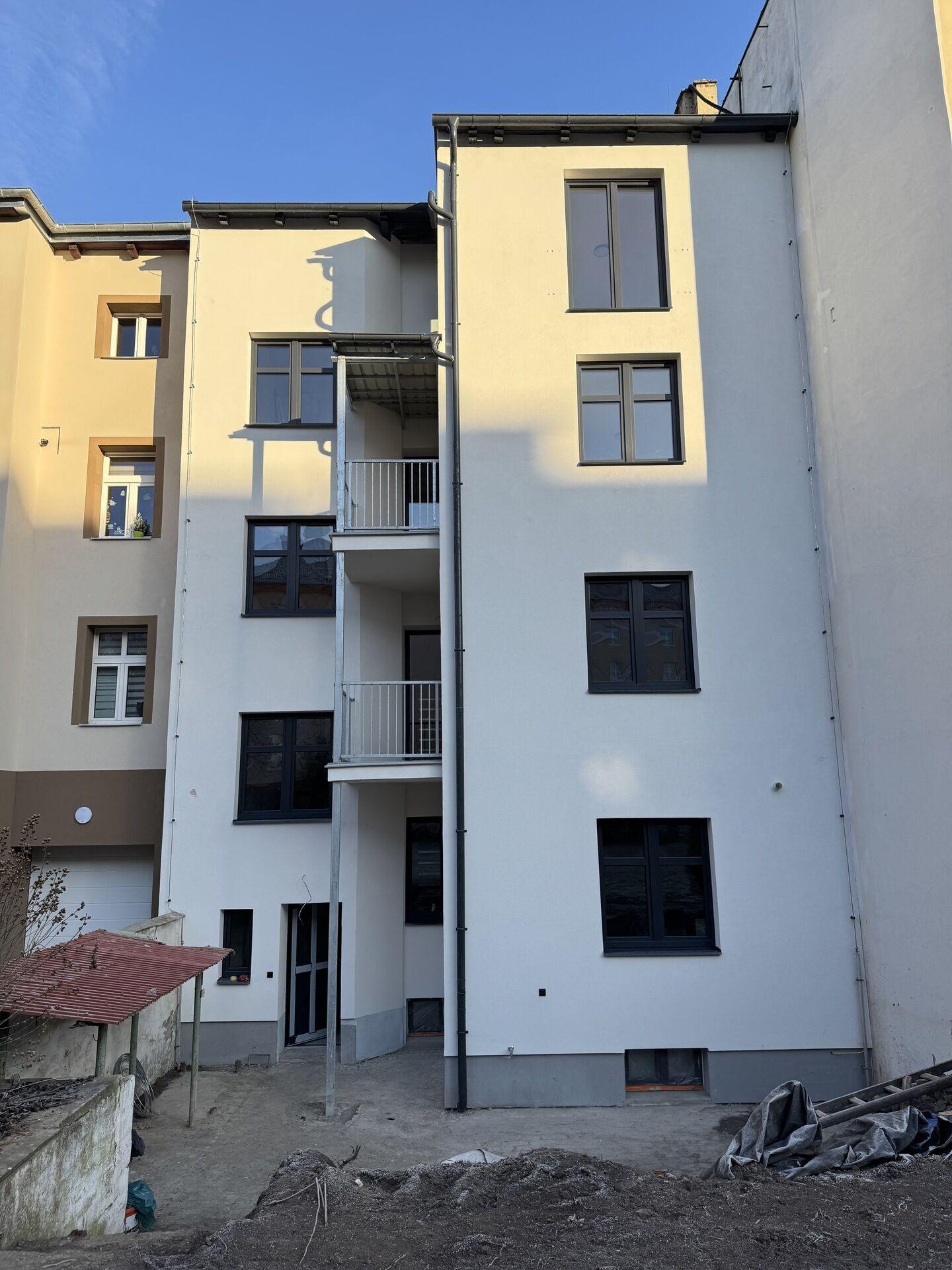 Zateplení fasády do uličního průčelí bude dokončeno na jaře 2026 – dům bude poté spadat do energetické třídy A – mimořádně hospodárný.