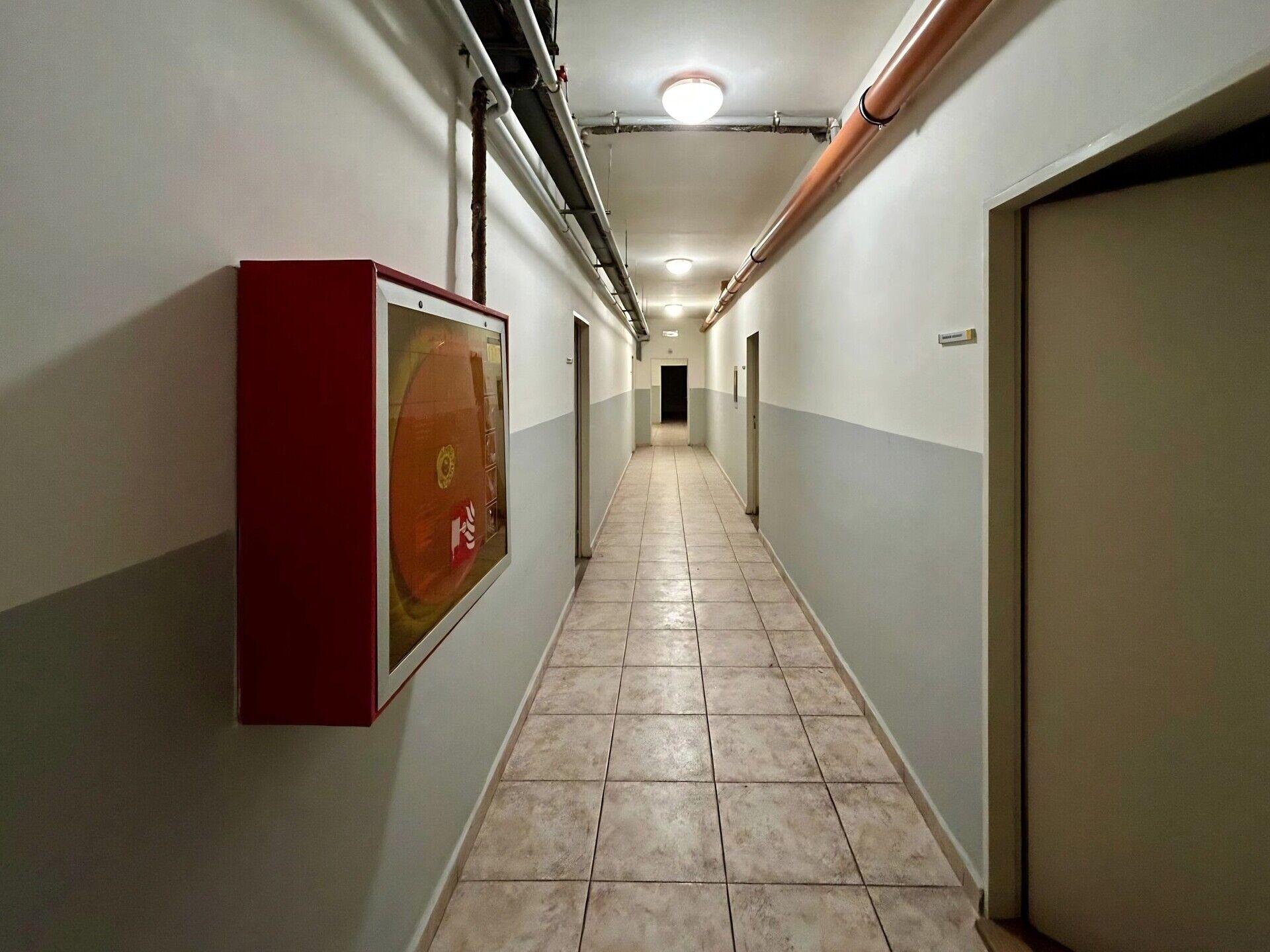 Dispozice 1. patra: bytová jednotka 2+1, 2 kanceláře, zasedací místnost, archiv a serverovna, sociální zařízení pro muže a ženy, úklidová místnost.
